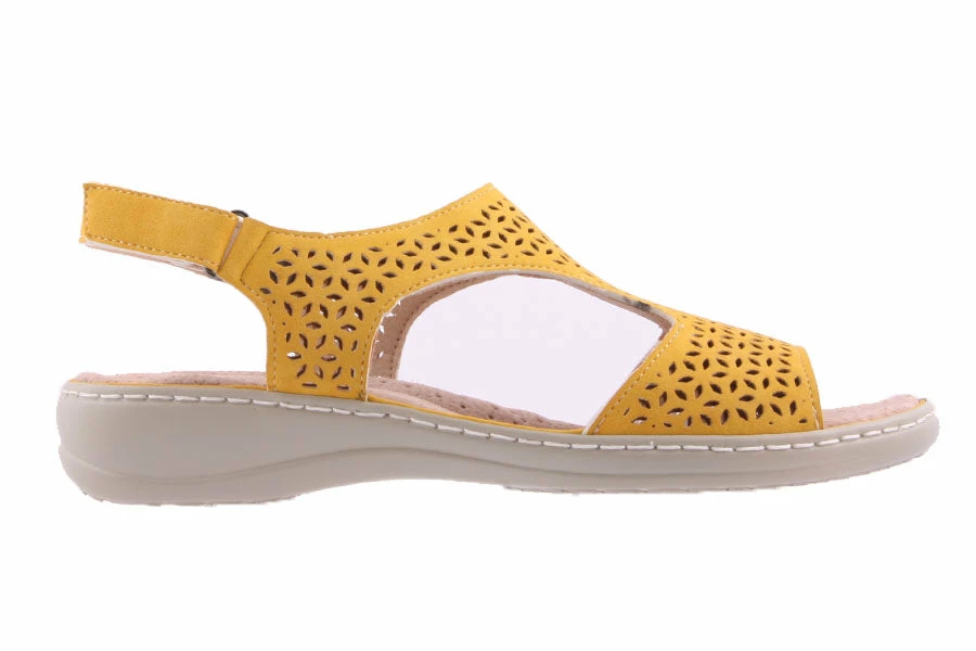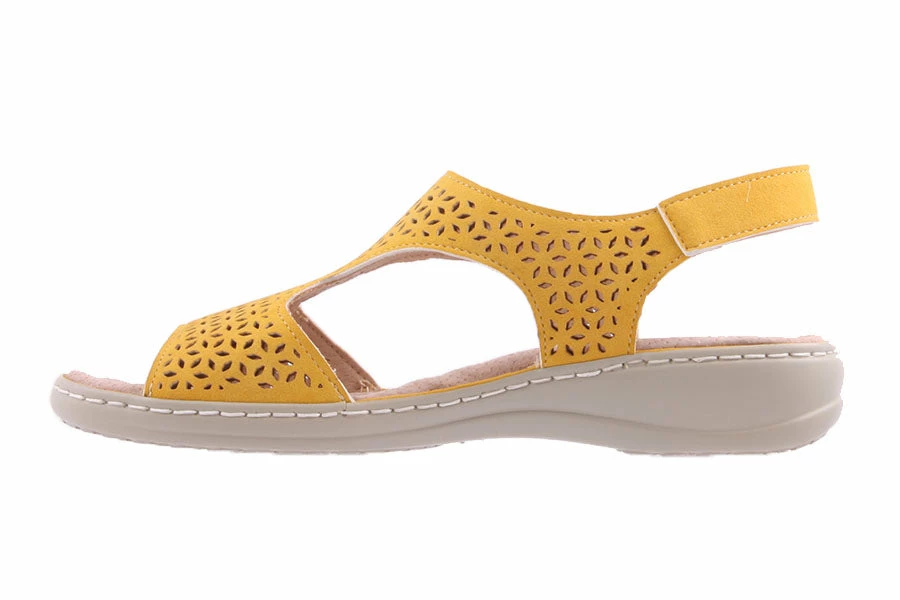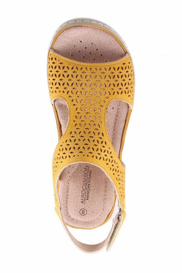 Mellin by Aero Cushion is a women’s wedge sandal featuring a laser cut upper with a velcro strap closure and a comfy padded leather lined insole.