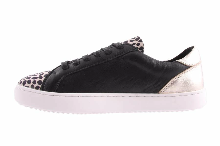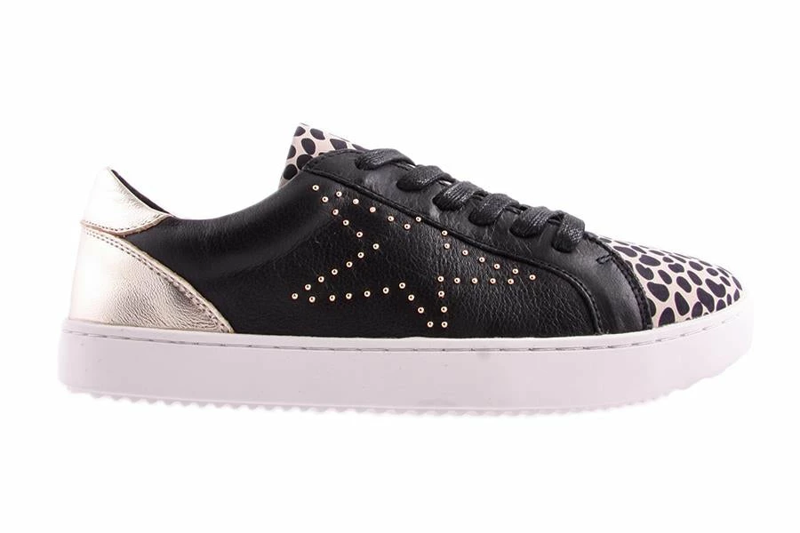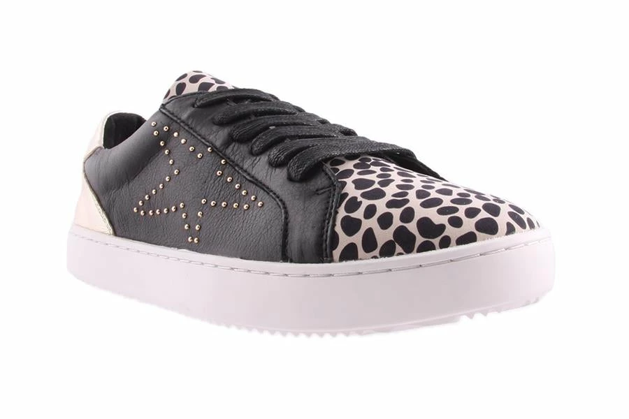 Vovo by Alfie And Evie is a women’s edgy lace up sneaker featuring a star stud trim, gold metallic heel and animal print front insert.