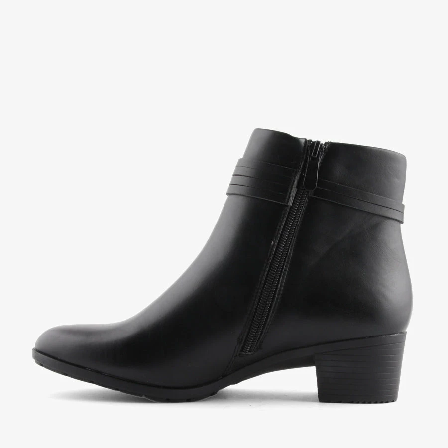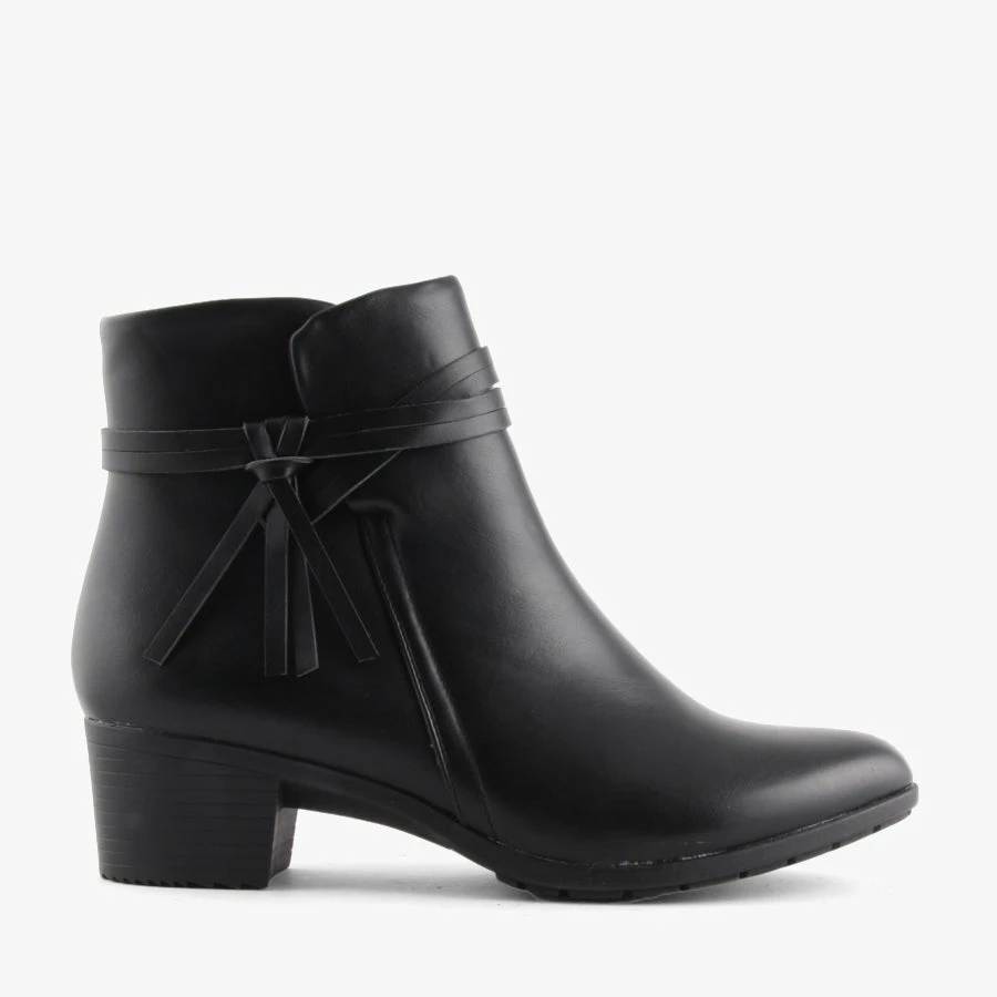Kaya by Baretraps is a women’s ankle boot with a block heel and rounded toe. Kaya features a smart leather-look upper, and a tassel detail on the side.