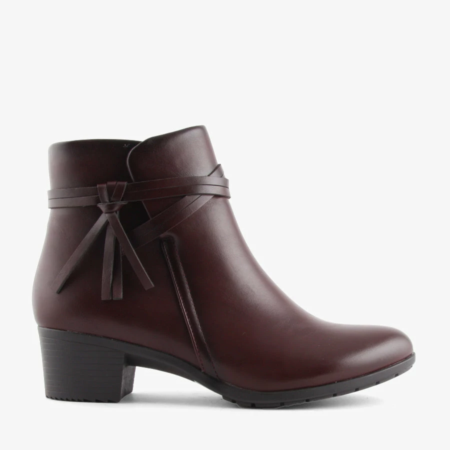 Kaya by Baretraps is a women’s ankle boot with a block heel and rounded toe. Kaya features a smart leather-look upper, and a tassel detail on the side.