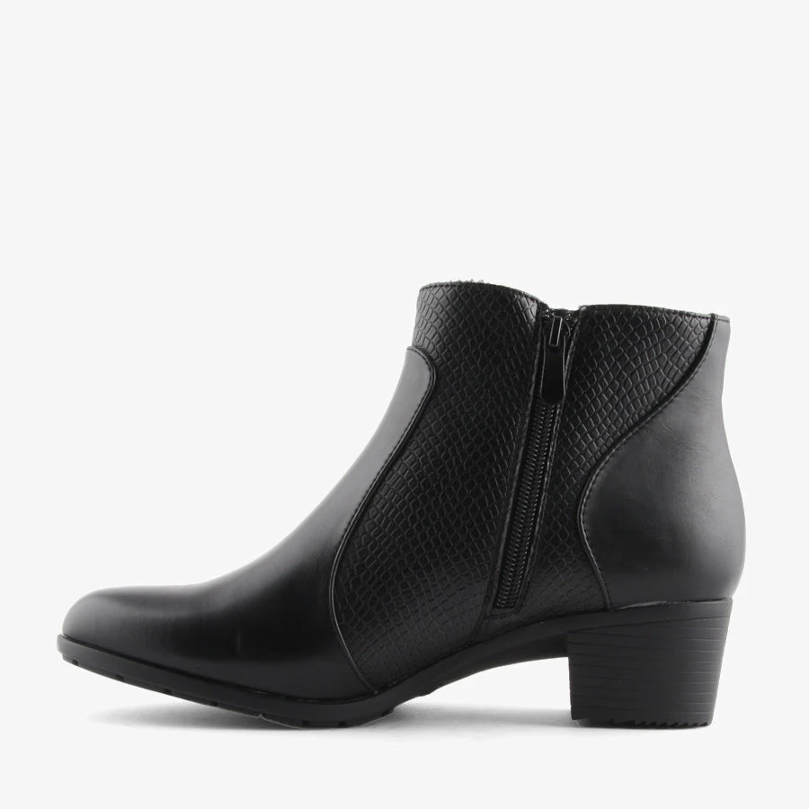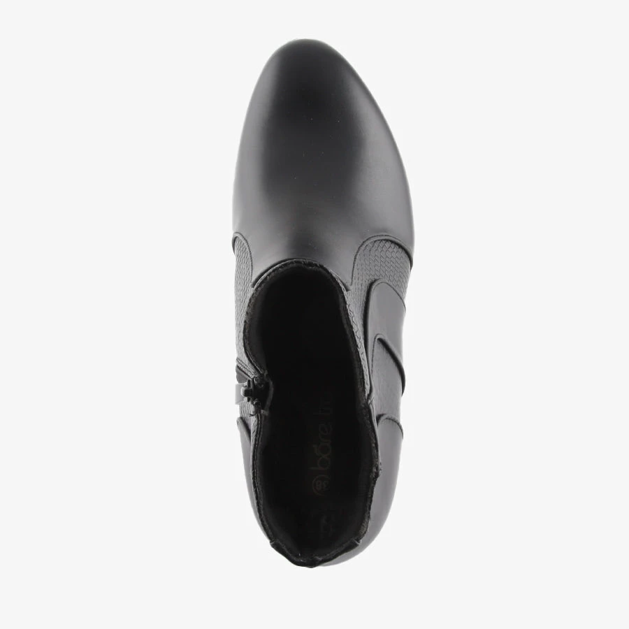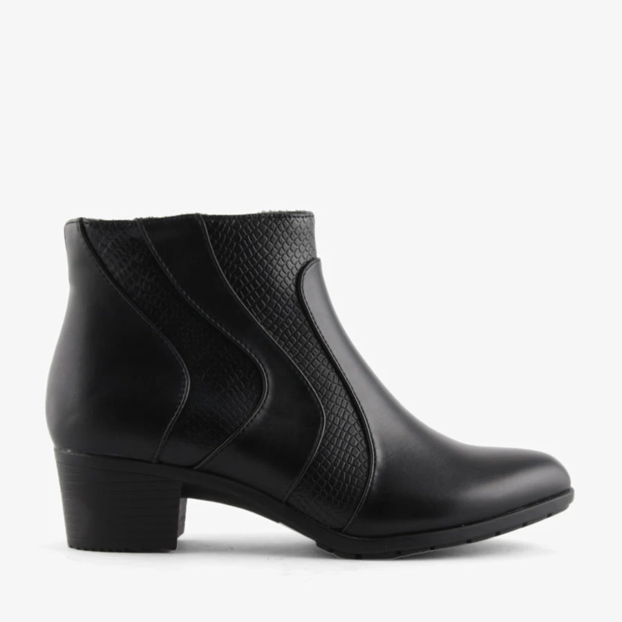 Kimora by Baretraps is a womens ankle boot with croc printed panels on the sides, a block heel, rounded toe and padded insole for all-day comfort.
