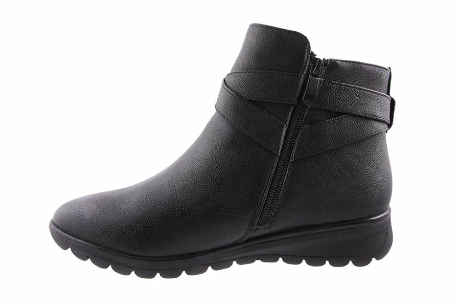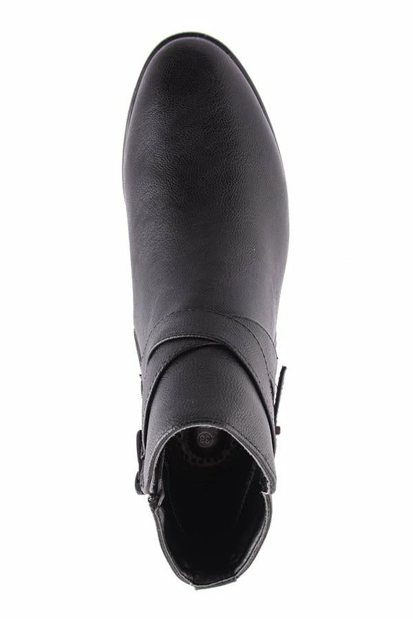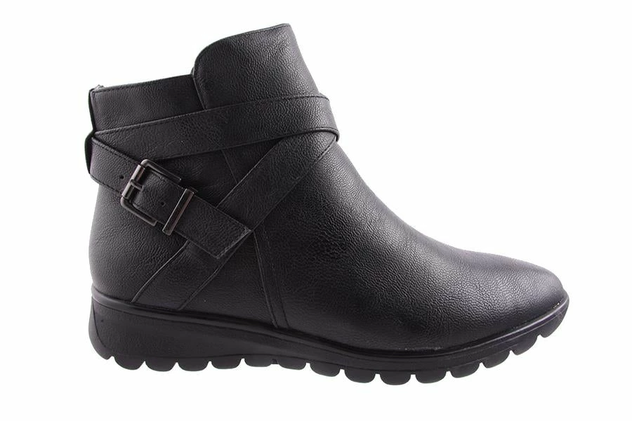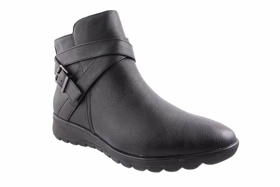 Kora by Baretraps is a woman’s ankle boot featuring a cross buckle detail, side zip and a low wedge for all day comfort.