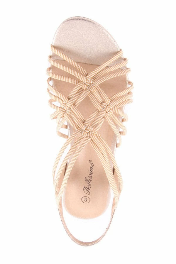 Portia by Bellissimo is a women’s sandal featuring elastic straps in a criss cross design on a low comfortable wedge sole.