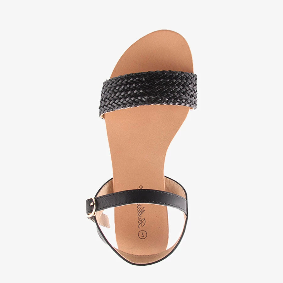 Khloe by Bellissimo is a women’s sandal that features a woven look front strap with a comfortable flat sole and buckle closure on the ankle.