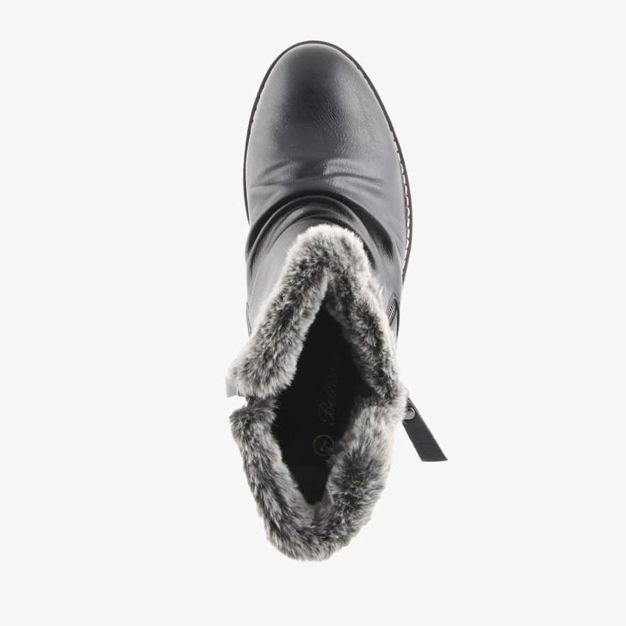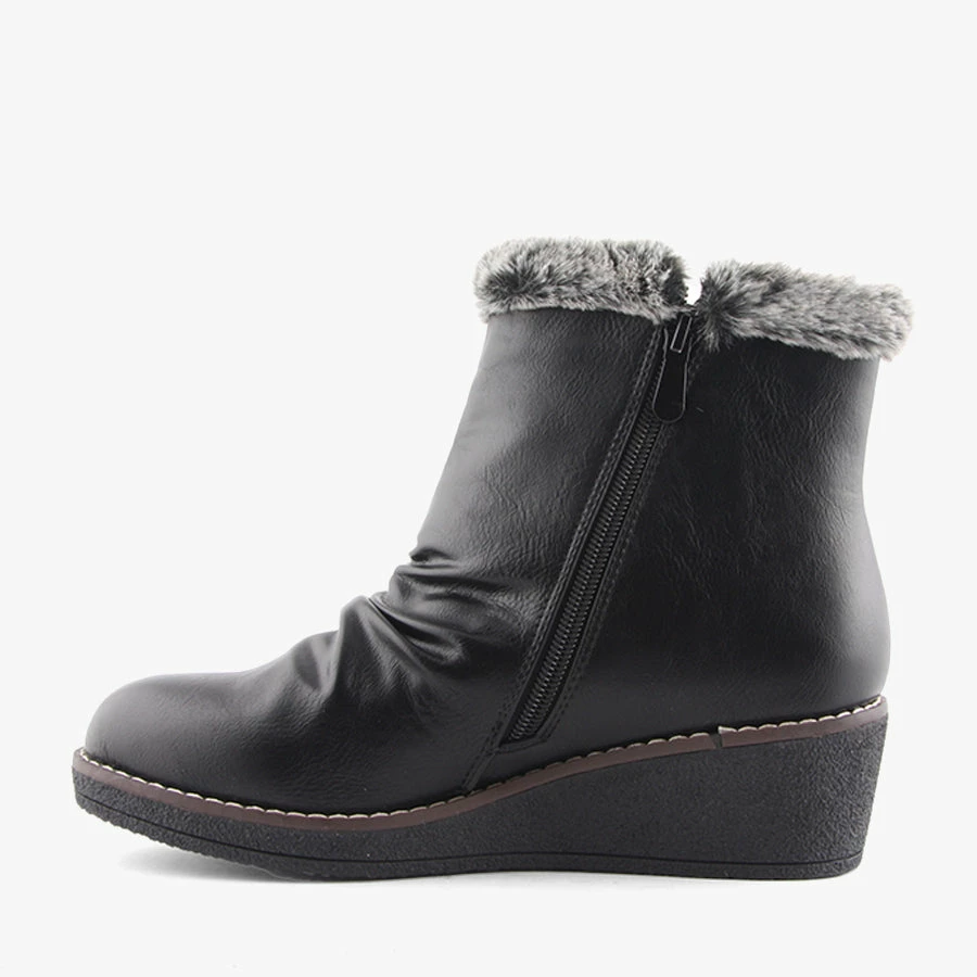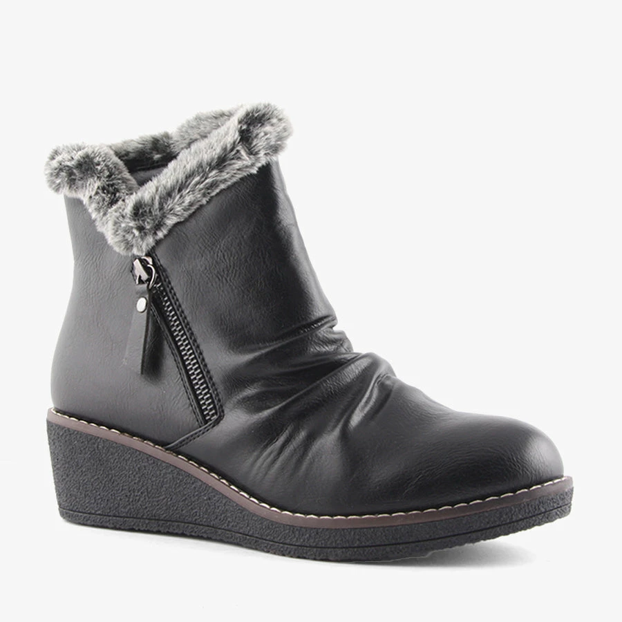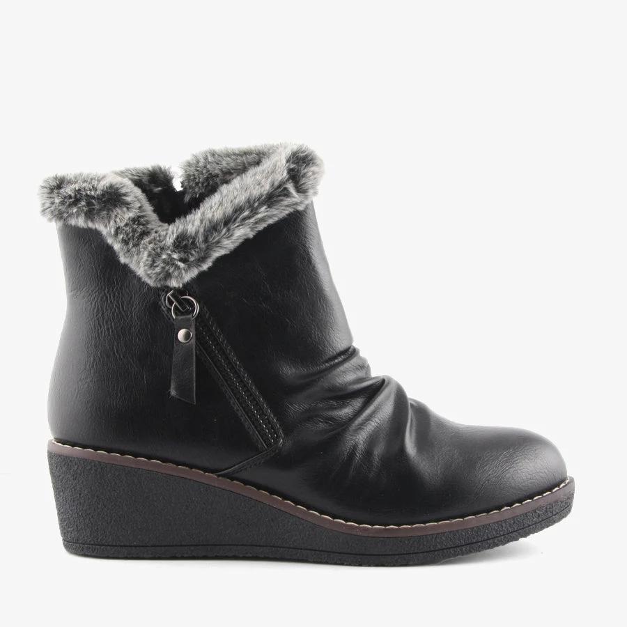 Cleary by Bellissimo is a women’s boot that features a comfortable low wedge, decorative outer zip with working inner zip, and a faux fur lining around the ankle.