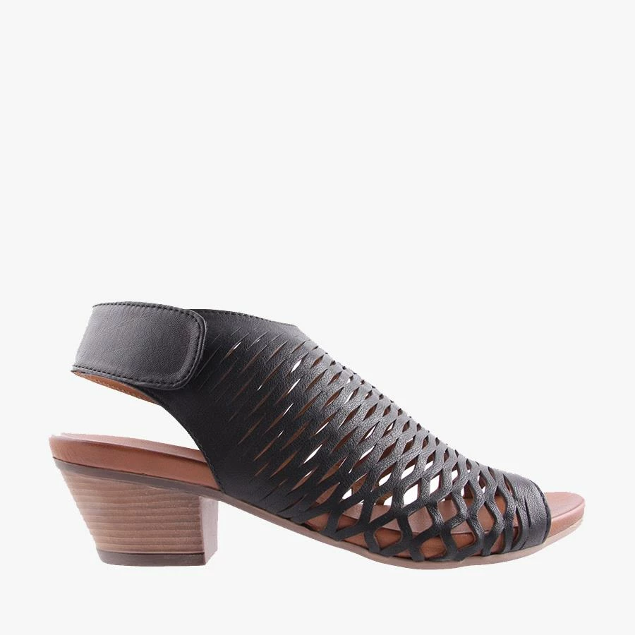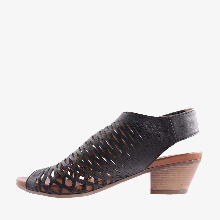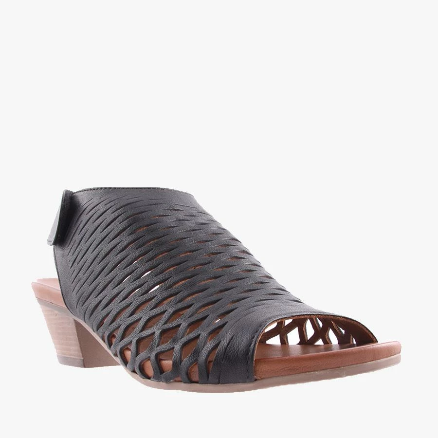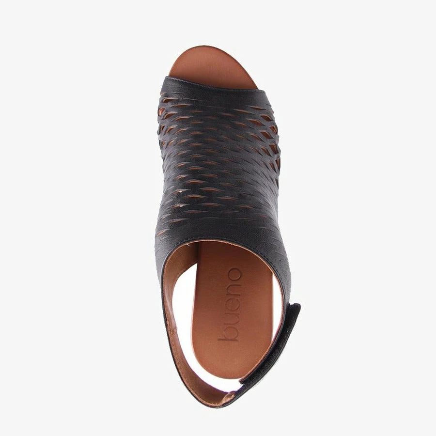 Ruby by Bueno is an open toed leather wedge sandal. Ruby has more foot coverage for extra support, an enclosed heel and a side buckle for easy fit.