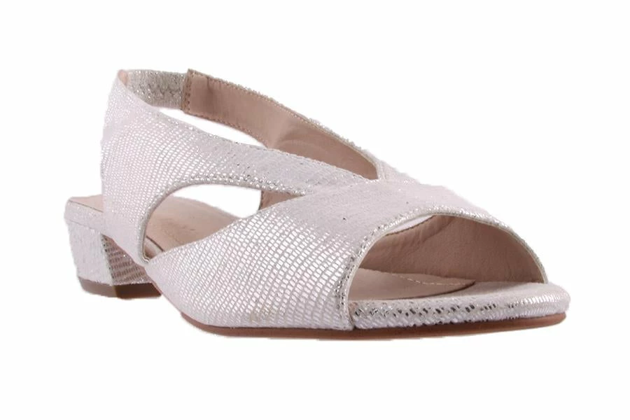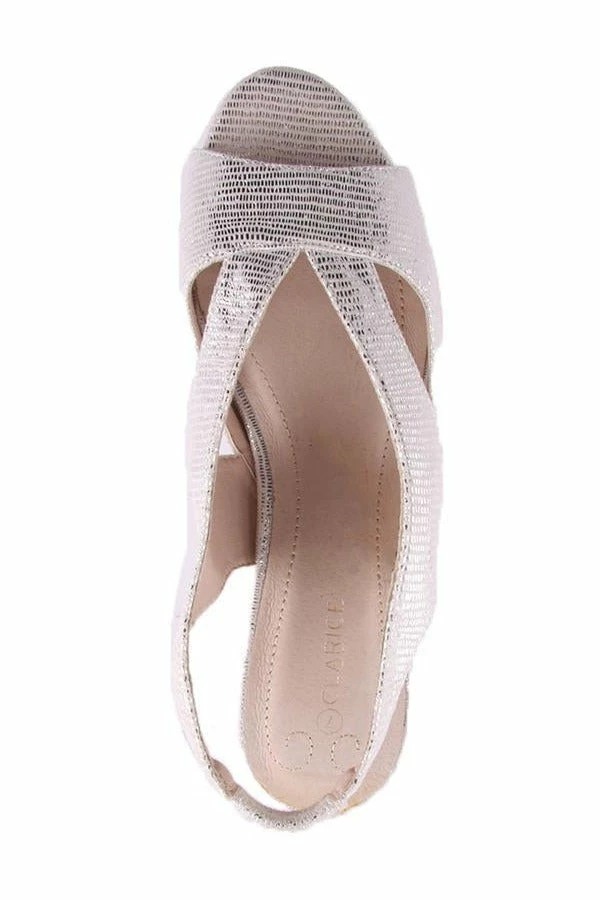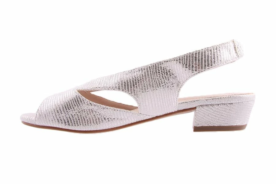 Case by Clarice is an elegant sling back sandal. Case features a small block heel, padded footbed, a peep toe and subtle snake print in metallic sliver giving it style and sophistication.