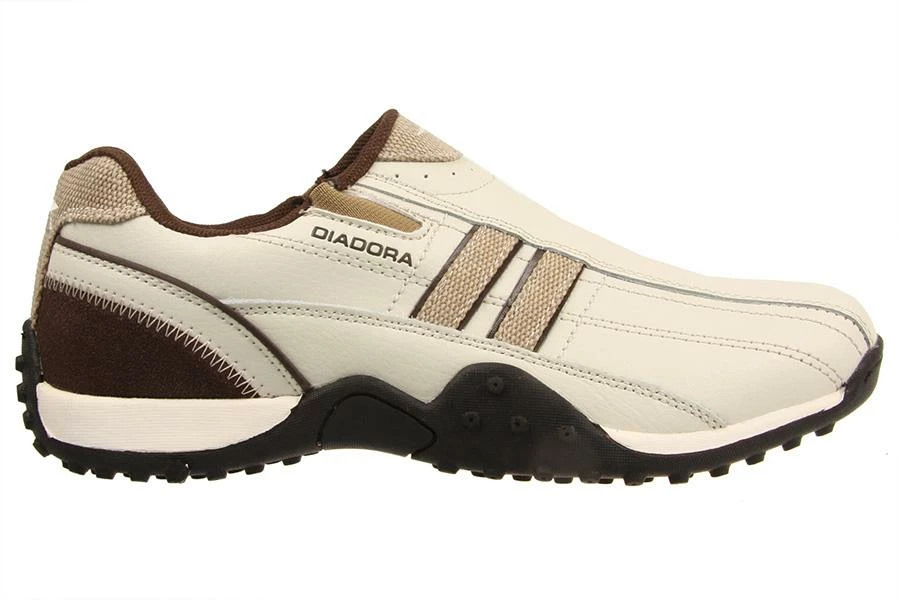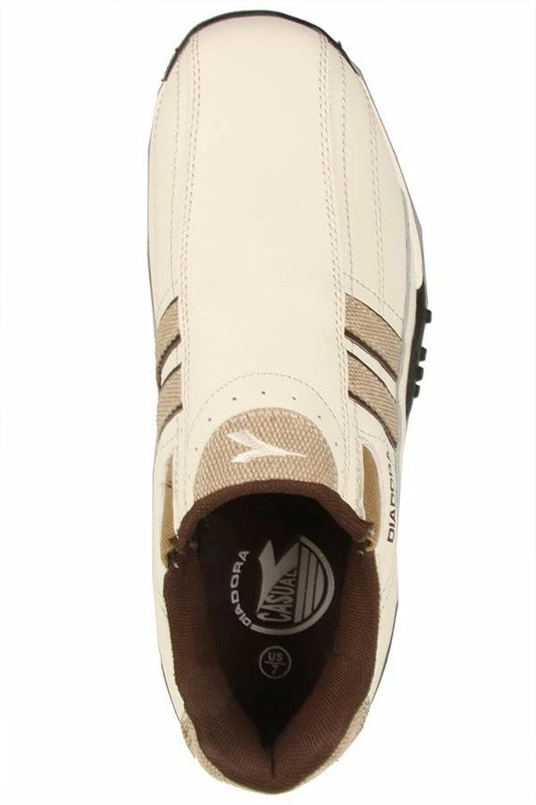 Joe Slip-on Off White by Diadora is a men’s casual slip on sneaker with a leather upper, featuring two stripes on both sides, including elastic gussets on the sides, man-made cushioned around the back ankle with a rubber sole .