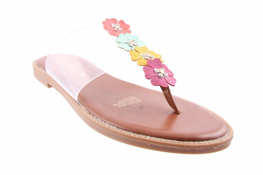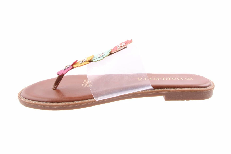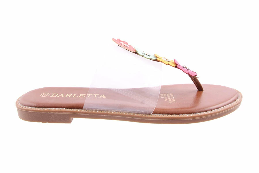 Clear by Barletta is a women’s thong featuring a padded sole, rhinestone studs around the footbed and a multicoloured flower detail over a wide clear strap.