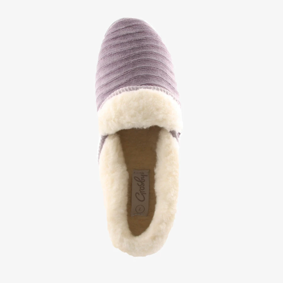 Camilla by Grosby is a women’s slipper with a faux-wool lining. Camilla features a high cut back with a folded edge and suede upper.