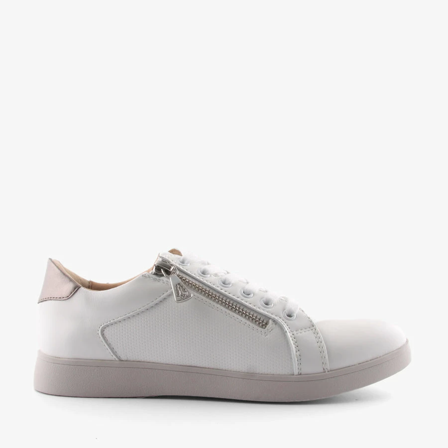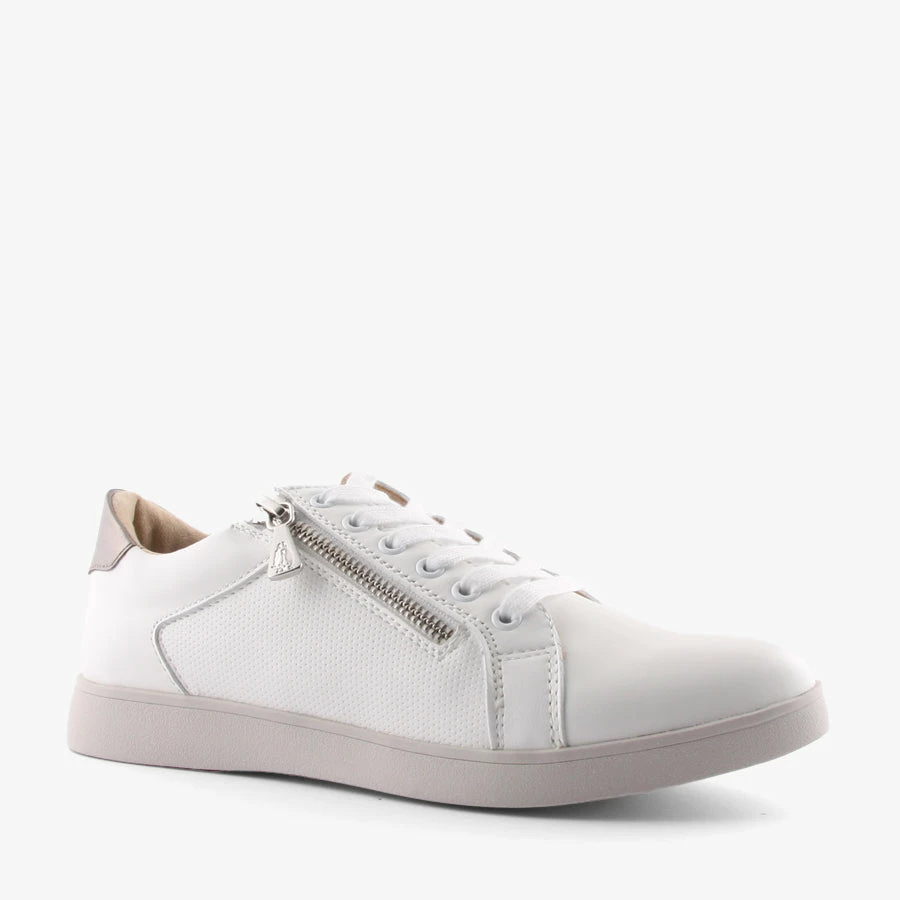 Comfort and style combine with Mimosa by Hush Puppies. These women’s on trend sneakers feature a smooth leather upper with a lace up front and side zipper entry finished with a removable padded insole.