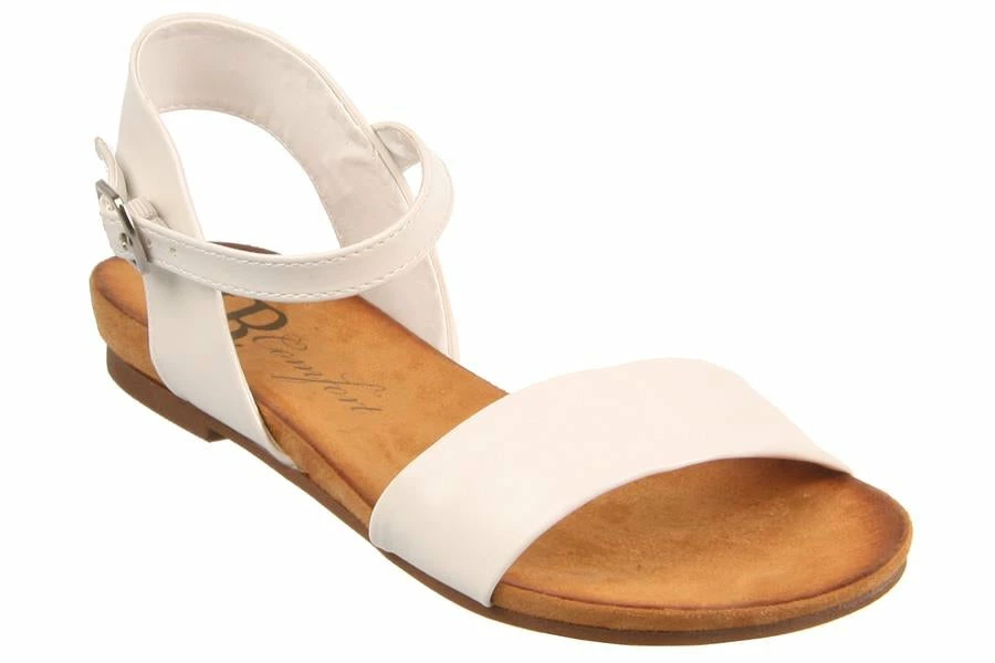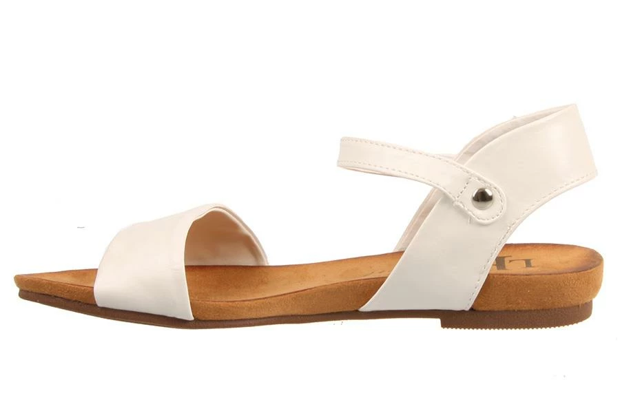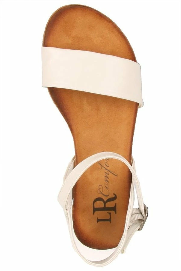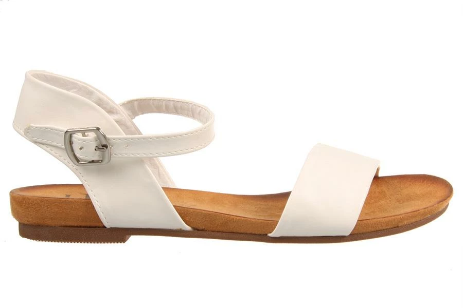 Voodoo White is women’s flat sandal featuring a single strap across the toes and a strap across the ankle with a gold finish buckle.