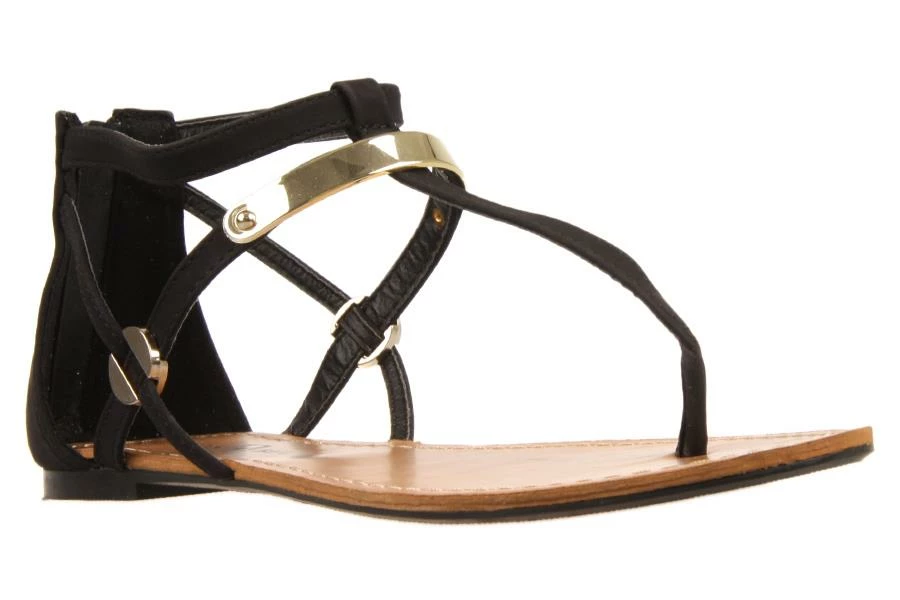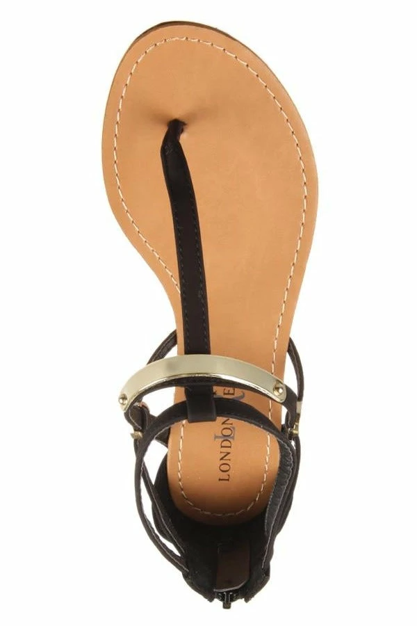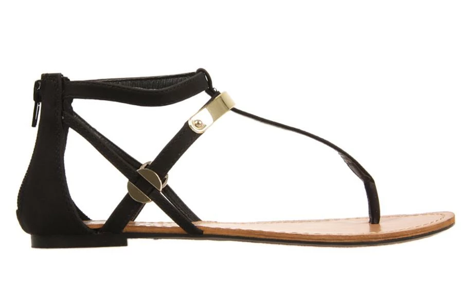 Summit by London Rebel is a women’s flat sandal featuring a T bar strap with gold details and a zippered back.