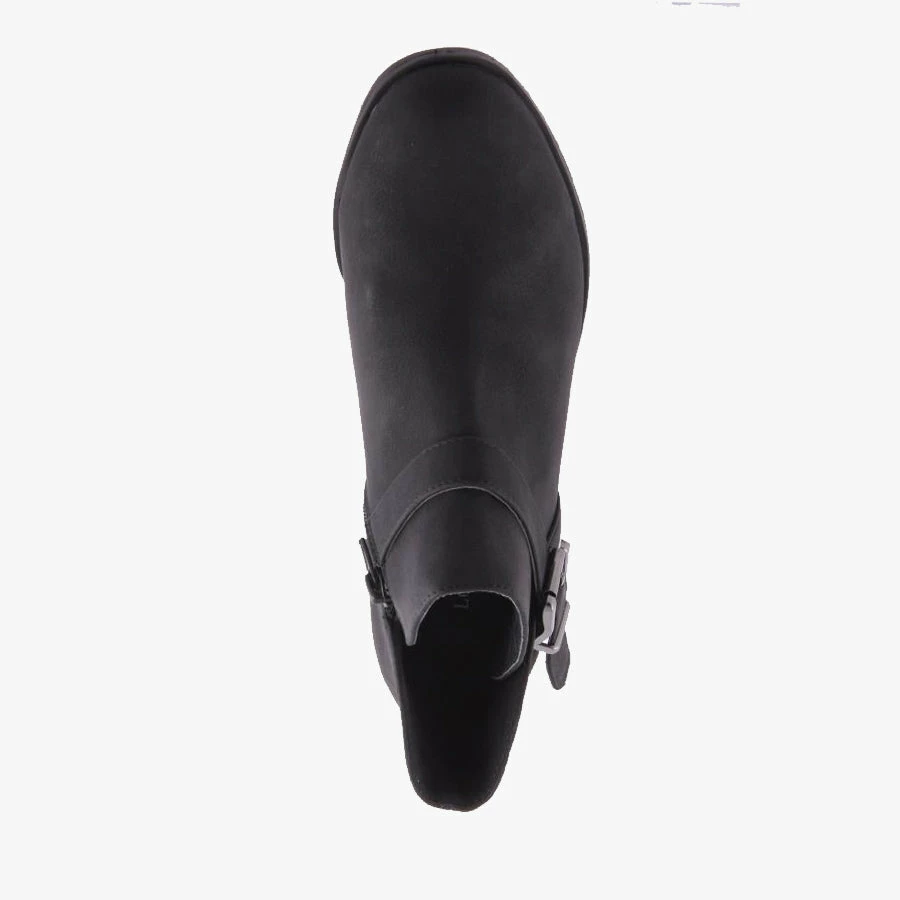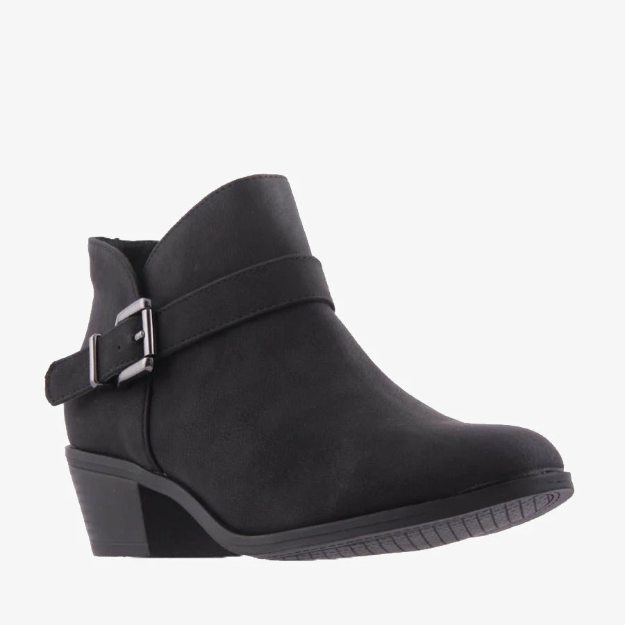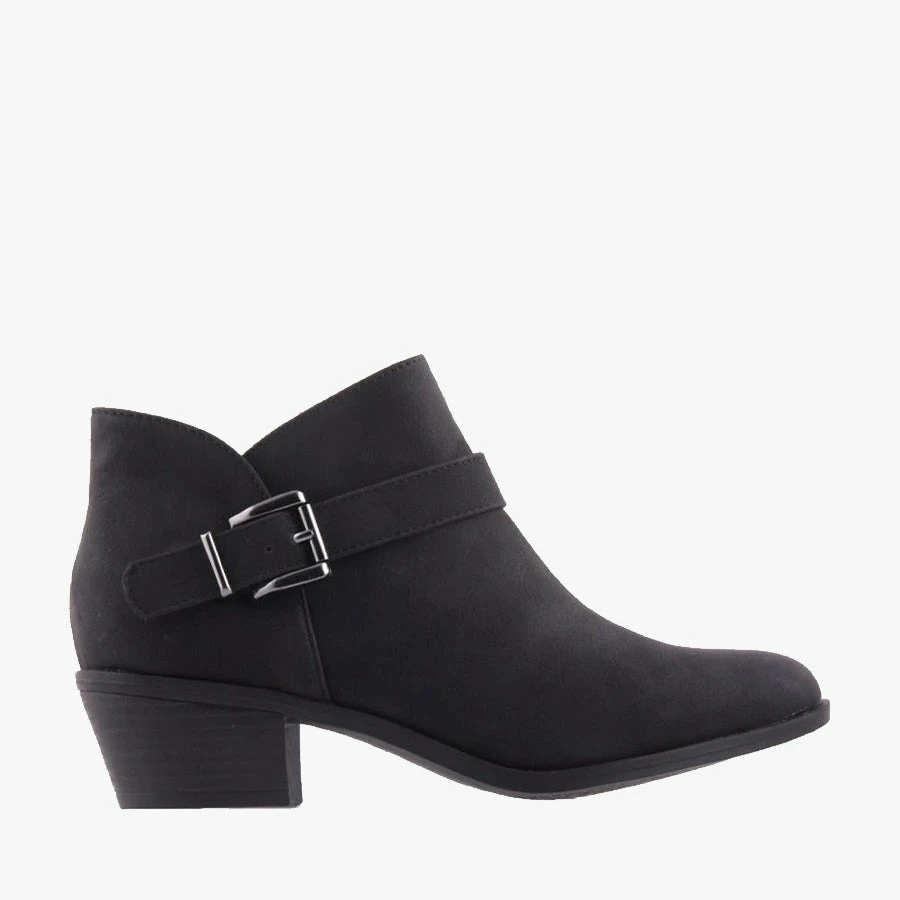 Lombre by London Rebel is a women’s ankle boot embellished with a buckled strap and side zipper on a low heel.