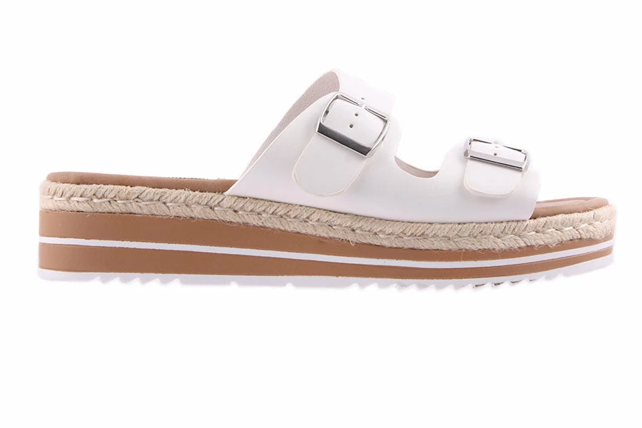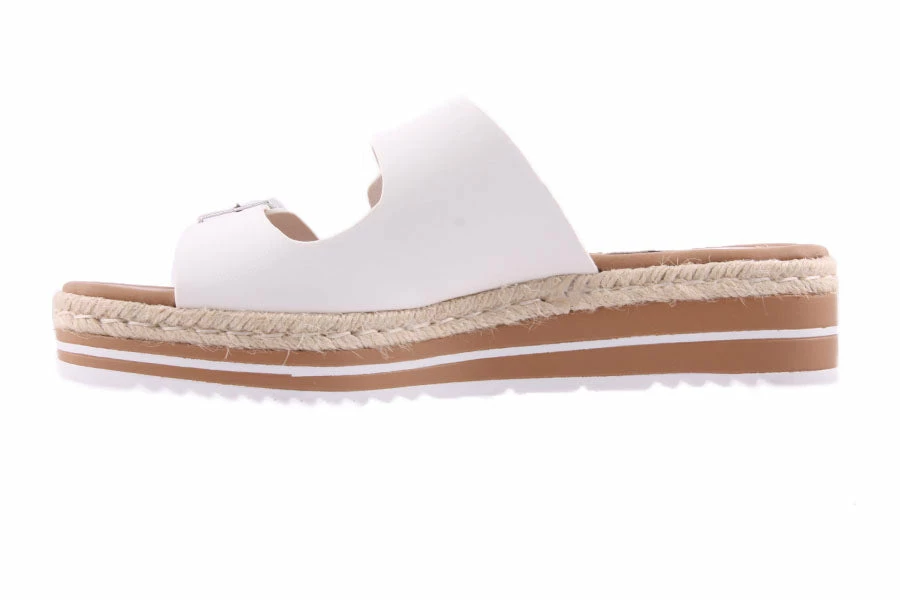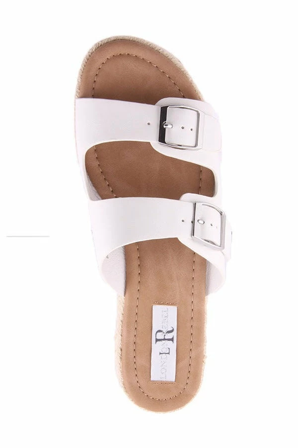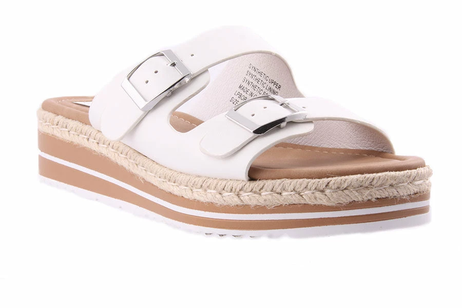 Borabora is a casual slide by London Rebel featuring a platform sole, adjustable buckles, and espadrille trim.
