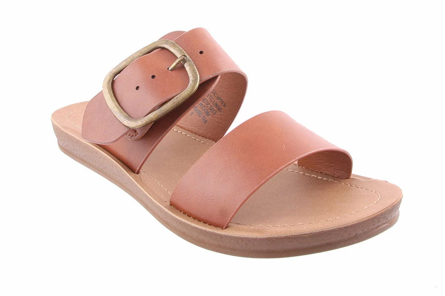 Slip into Rosario by London Rebel. This simple womens sandal features a two strap design and large buckle.