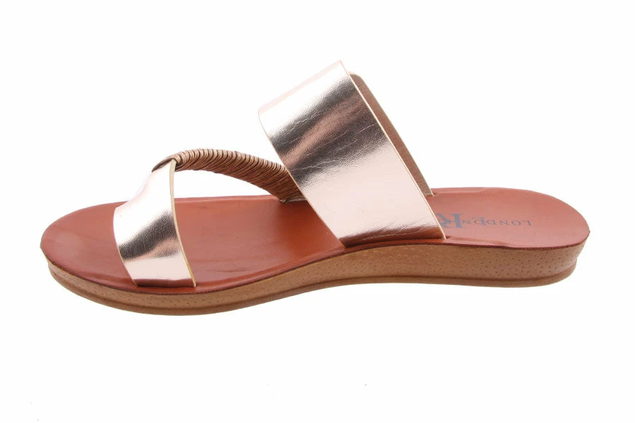 Slide into Riviera by London Rebel. This casual womenοΏ½s sandal features a metallic gold upper, a buckled strap and wrap over embellishment.
