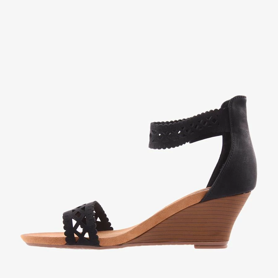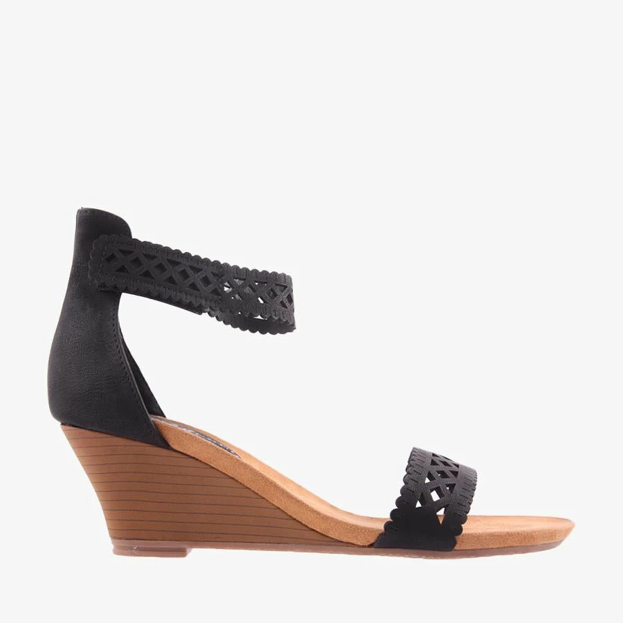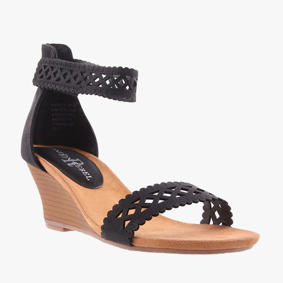 Begonia by London Rebel is a women’s wedge sandal featuring cut outs on the toe and ankle strap finished with a velcro closure and soft microsuede insole.