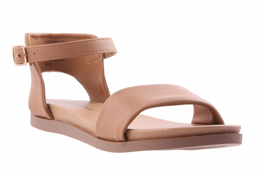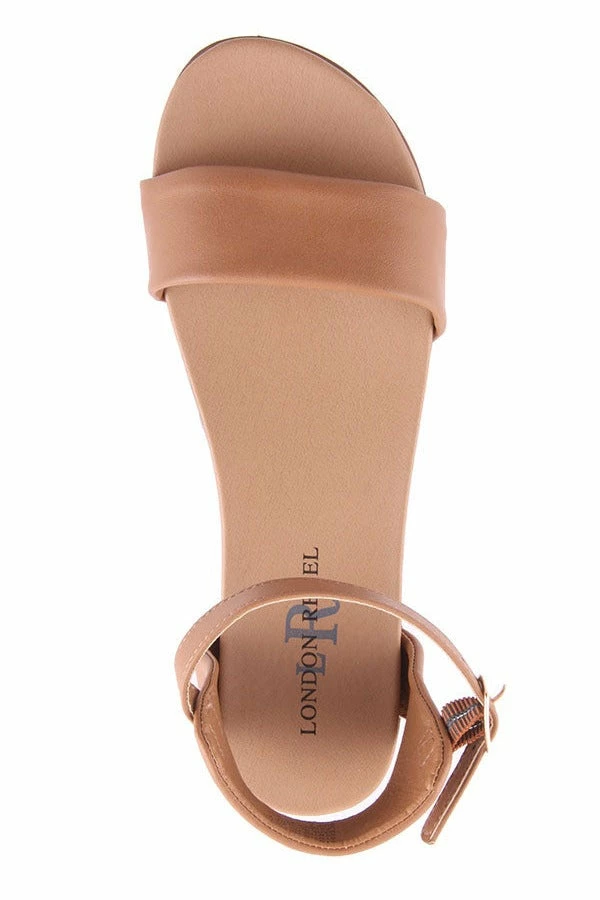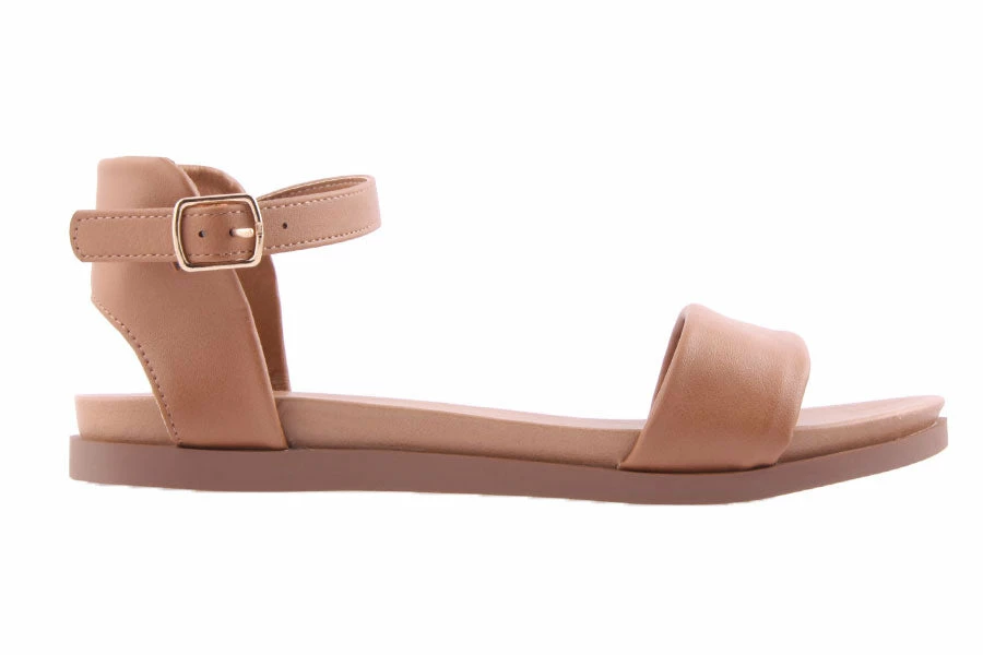 This flat sandal by London Rebel is staple for every wardrobe. Samesies features a high back, gold buckled ankle strap and padded sole.