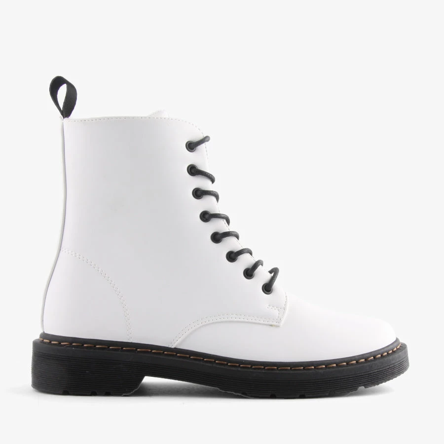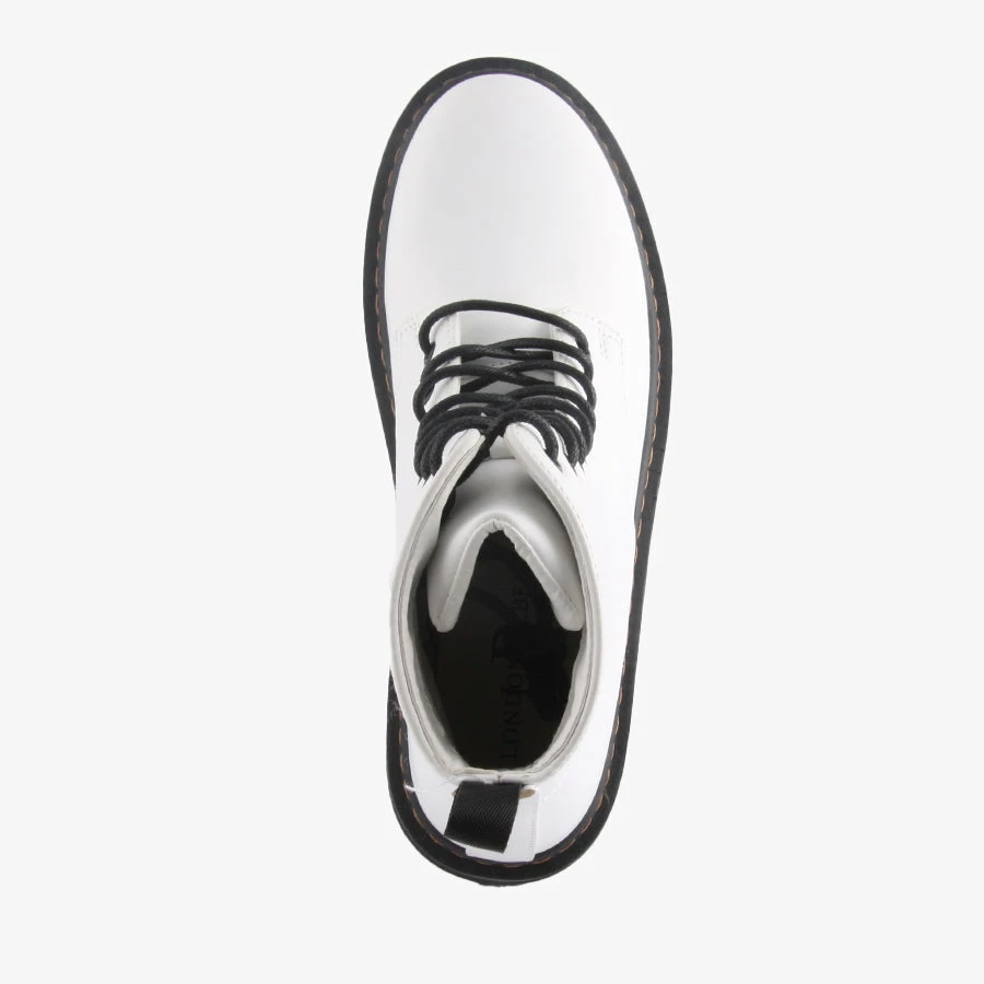 Rookie by London Rebel is a women’s Combat style lace up boot, featuring a chunky treaded sole with exposed stitching and a back pull tab.