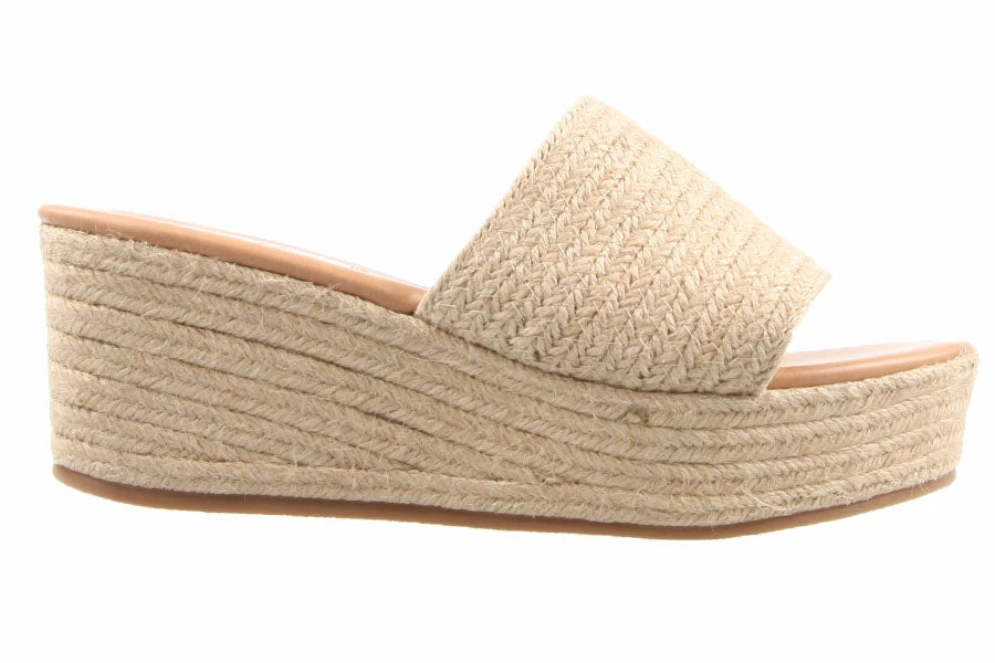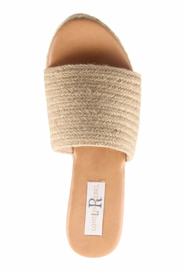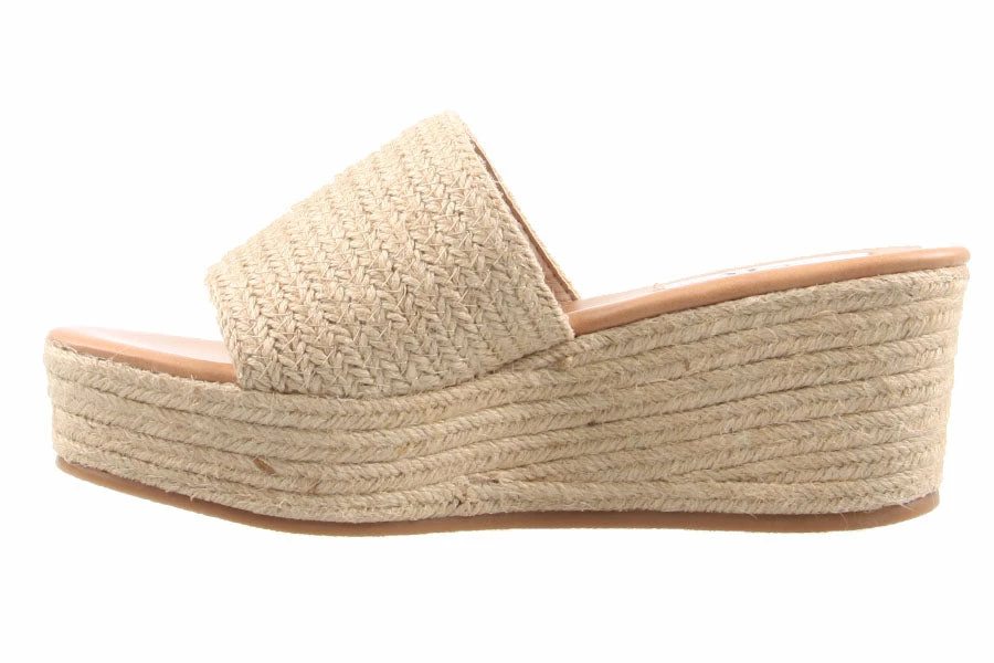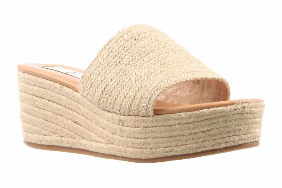 Slide into Maki by London Rebel. This women’s wedge sandal features a woven style upper and matching espadrille sole.