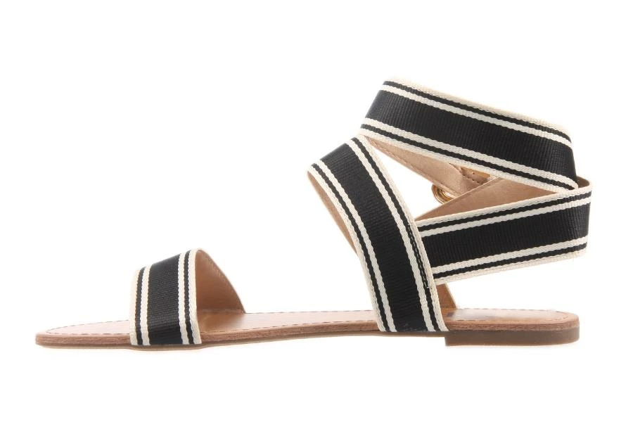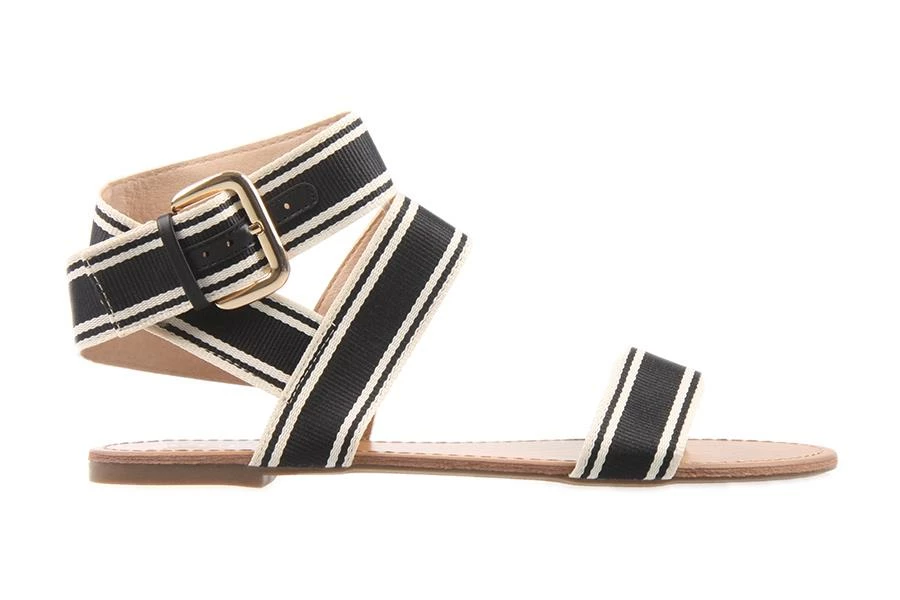Celine by London Rebel is a flat sandal featuring an over-the-toe strap and another over the vamp that connects to a wrap-around strap fastened with a statement buckle and PU detailed strip.