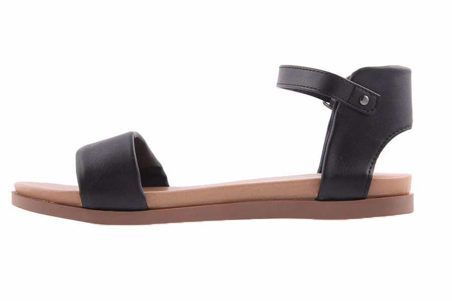 This flat sandal by London Rebel is staple for every wardrobe. Samesies features a high back, gold buckled ankle strap and padded sole.