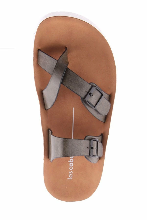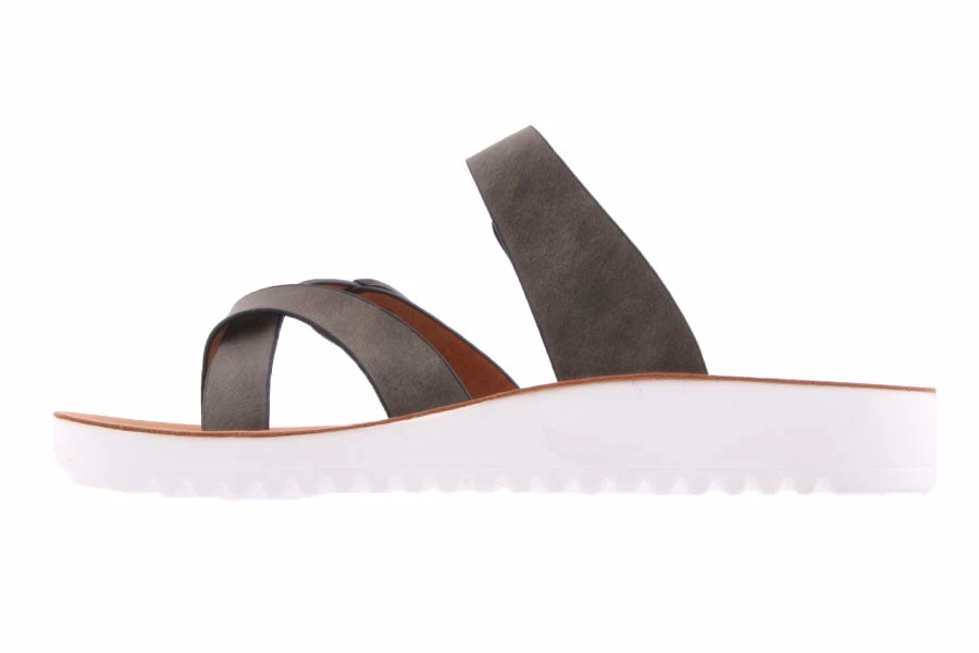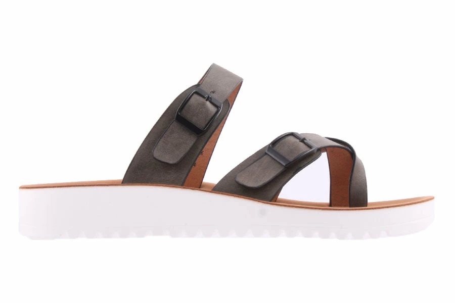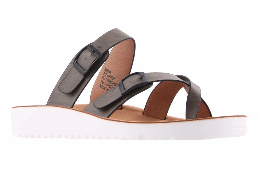 Nin by Los Cabos is a women’s slip on sandal featuring two adjustable buckled straps and a shaped insole on a contrasting white sole.