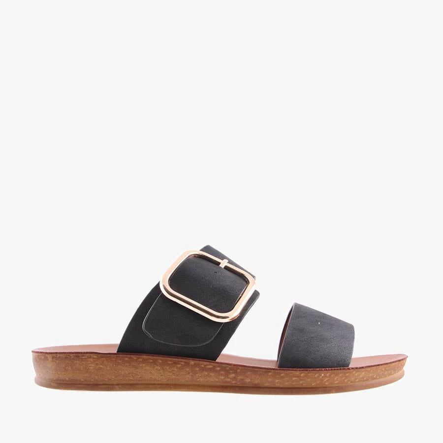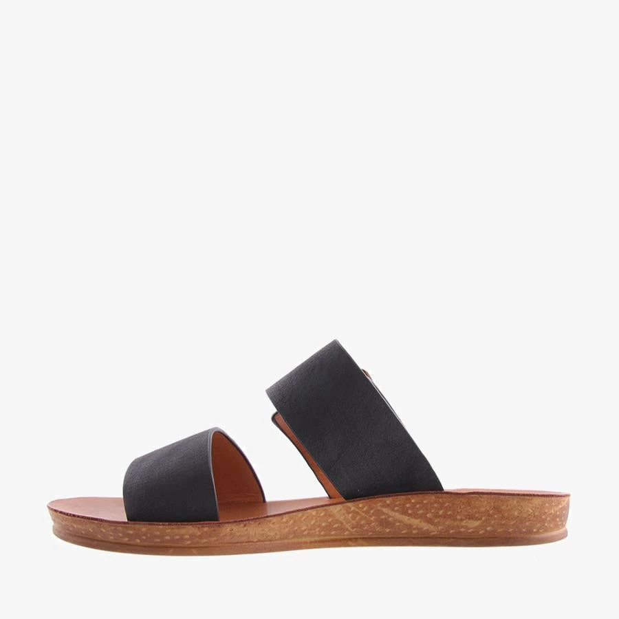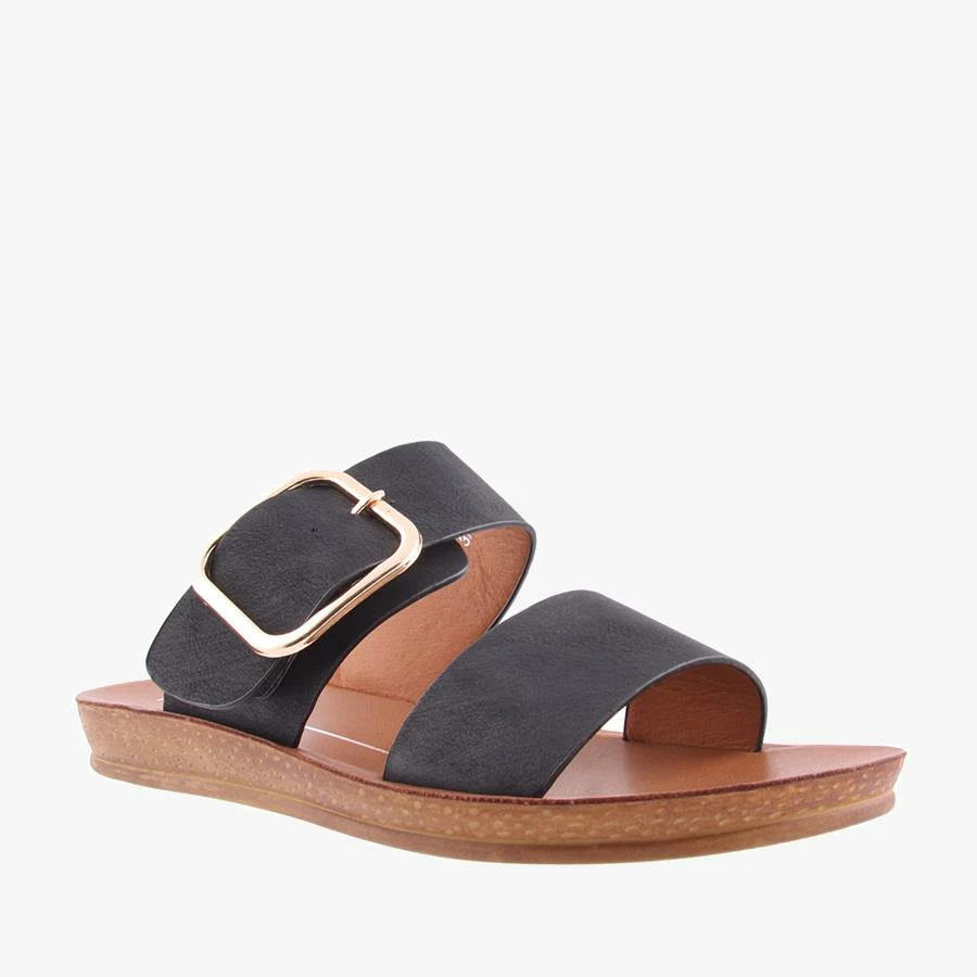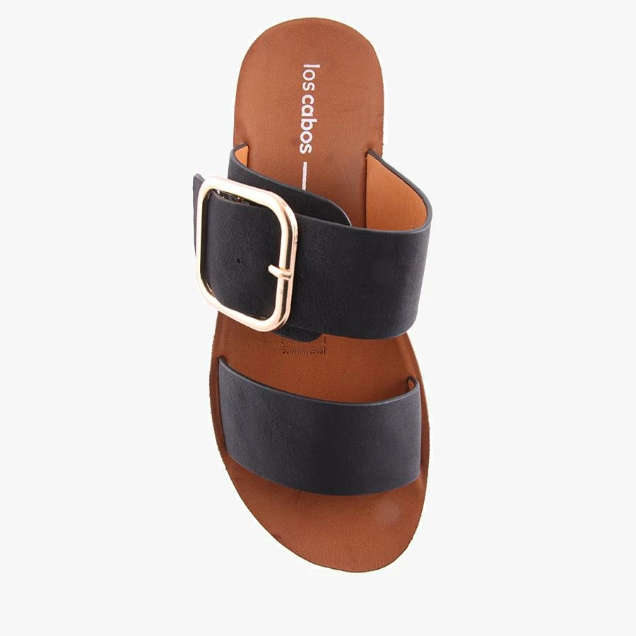 Doti by Los Cabos is a women’s slide sandal featuring dual straps over the foot with a statement gold buckle on a flat sole.