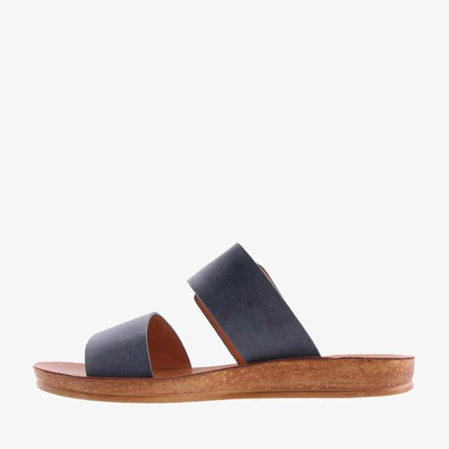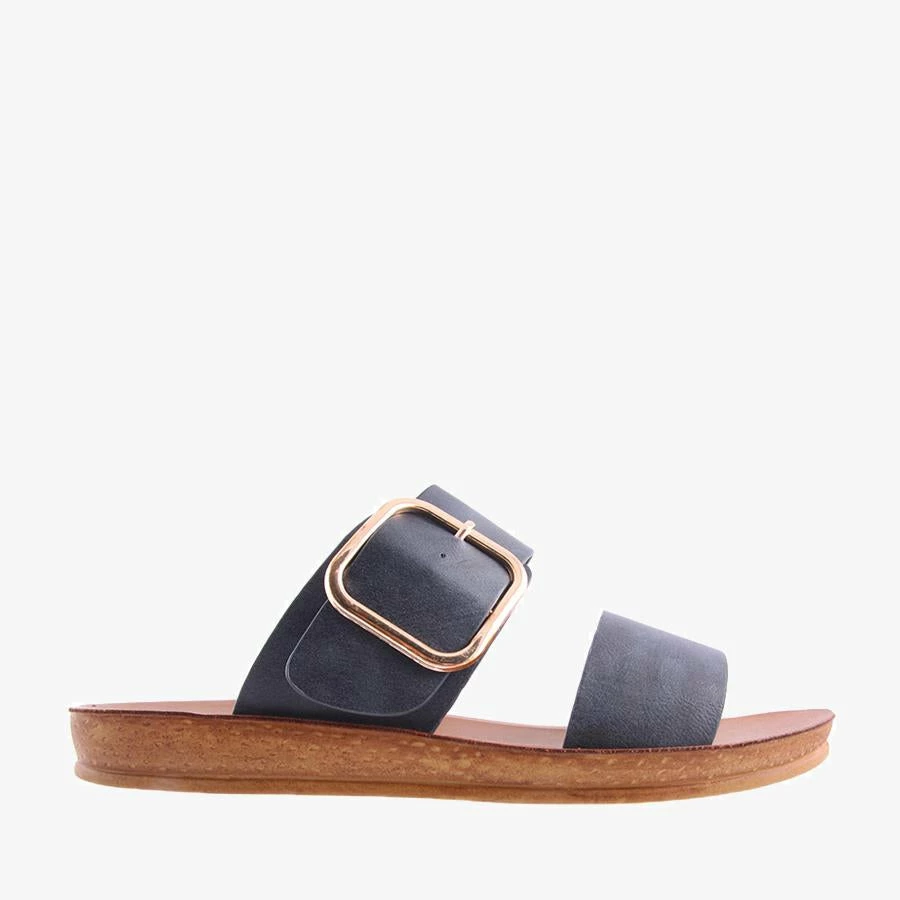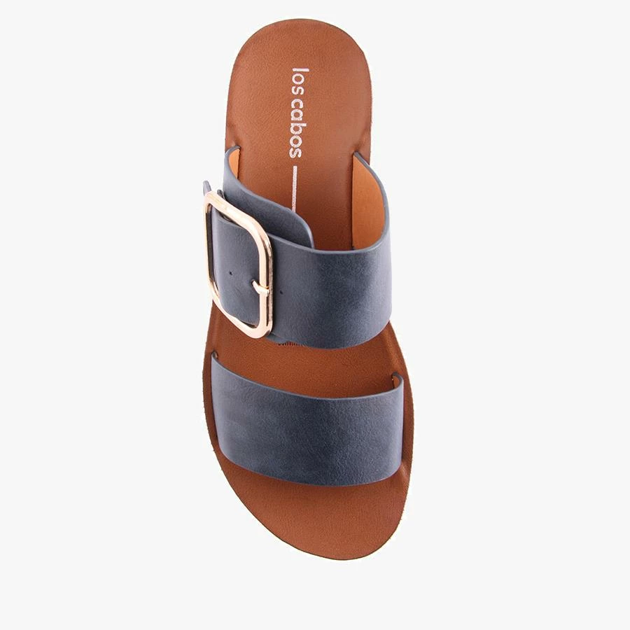 Doti by Los Cabos is a women’s slide sandal featuring dual straps over the foot with a statement gold buckle on a flat sole.