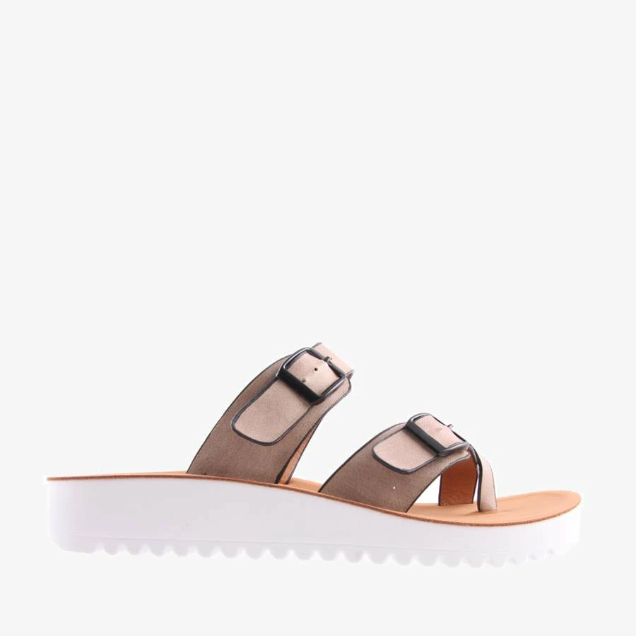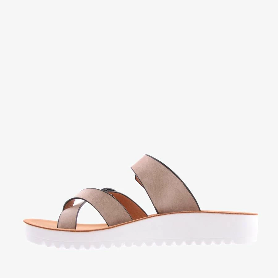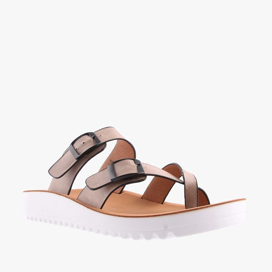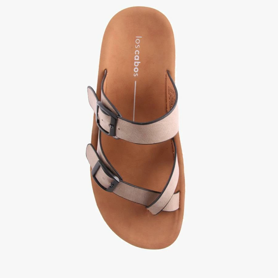 Nin by Los Cabos is a women’s slip on sandal featuring two adjustable buckled straps and a shaped insole on a contrasting white sole.
