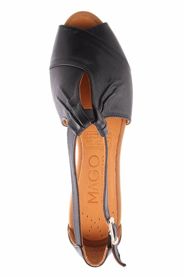 Fedora by Mago is an open toed leather sandal. Fedora has more foot coverage for extra support, an enclosed heel and a side buckle for easy fit