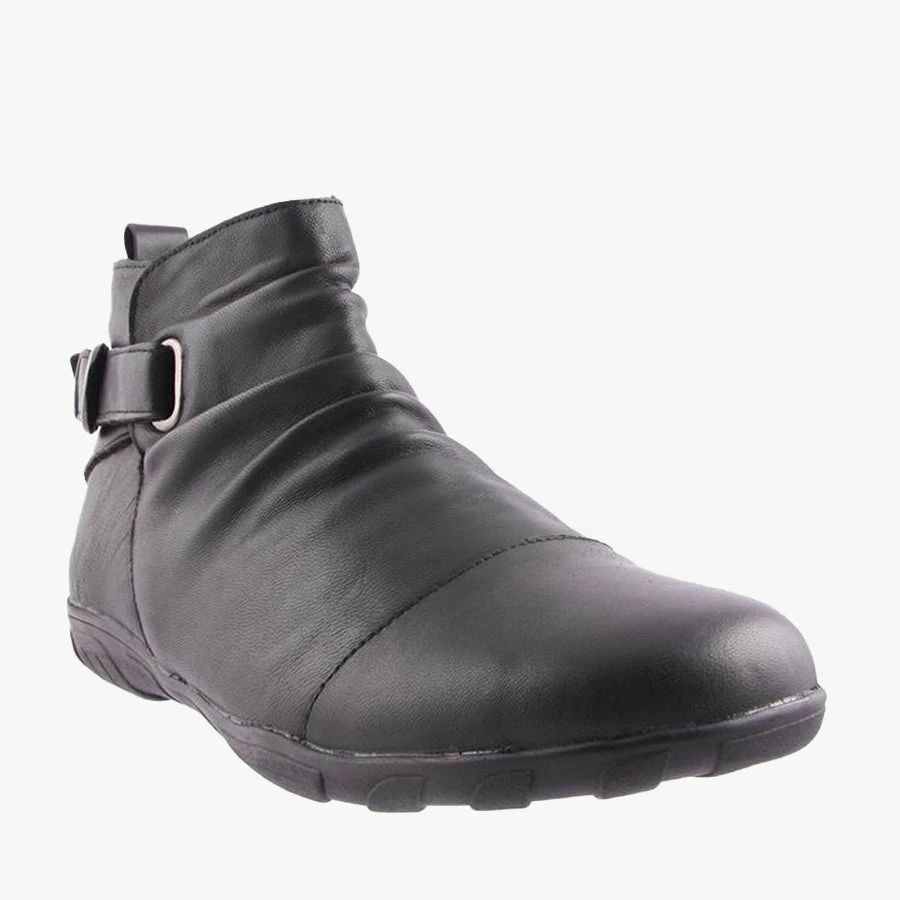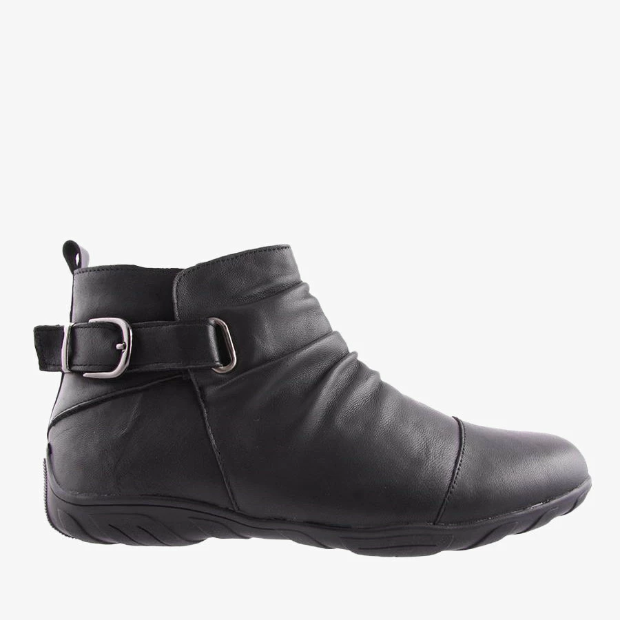 Quench by Natural Comfort is a women’s ankle boot that features a comfortable flat sole, ruched leather upper and statement buckle detail.