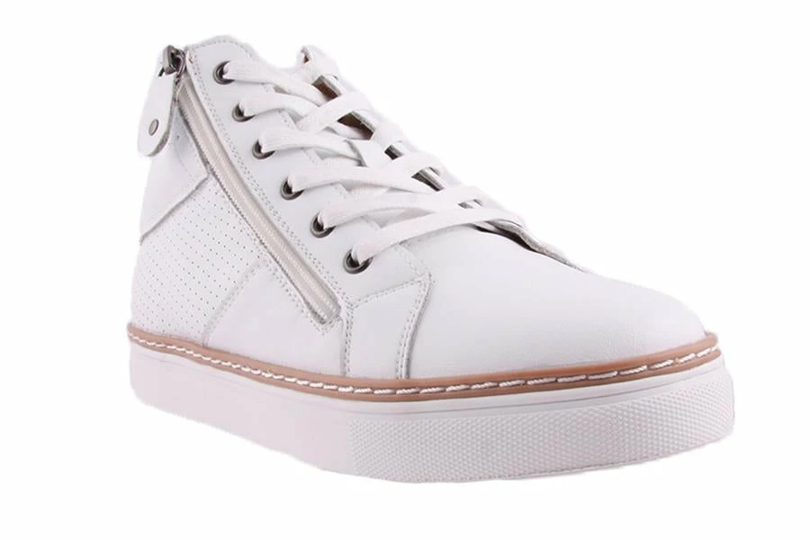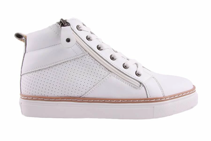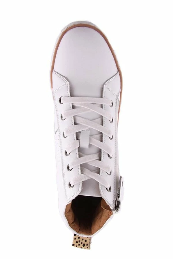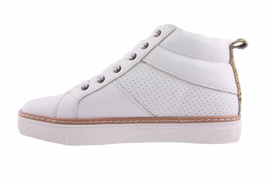 Voodoo by Natural Comfort is a woman’s high cut lace up sneaker that features a removable padded insole, perforated details on the side and leopard details on the heel.