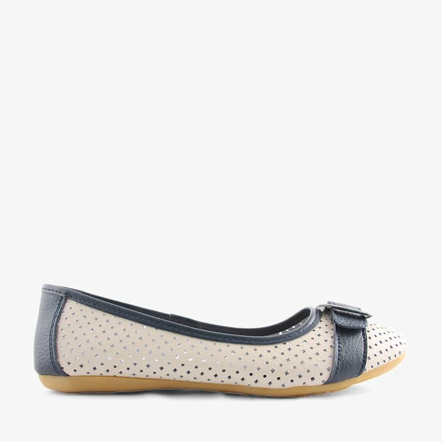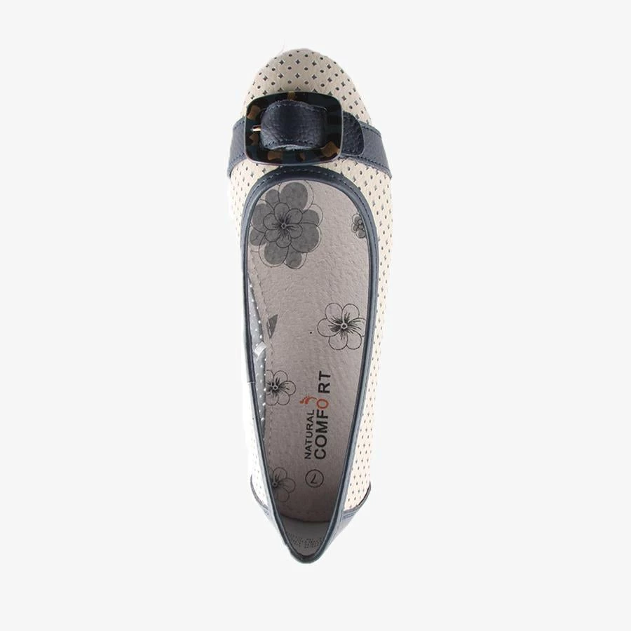 Almond by Natural Comfort is a women’s leather ballet flat that features a laser cut perforated design and a faux animal print buckle across the toe with a flexible outsole.