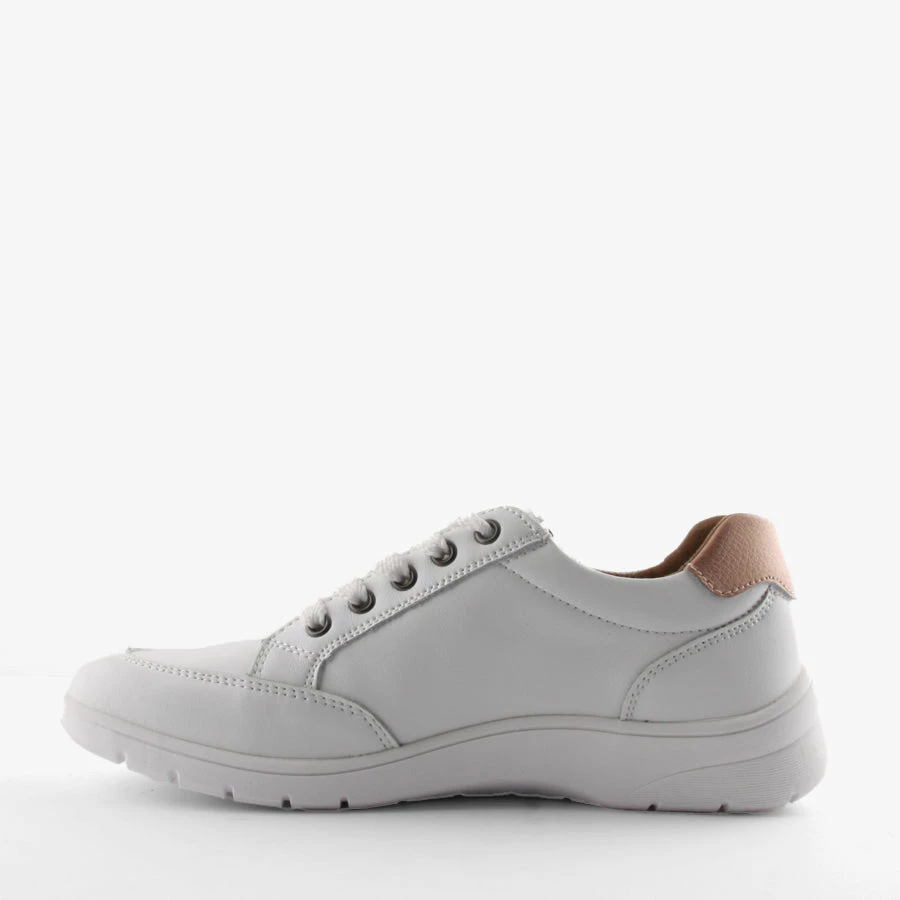 Dulcera by Natural Comfort is a women’s leather sneaker with a front zipper and rose gold panel on the back of the heel.