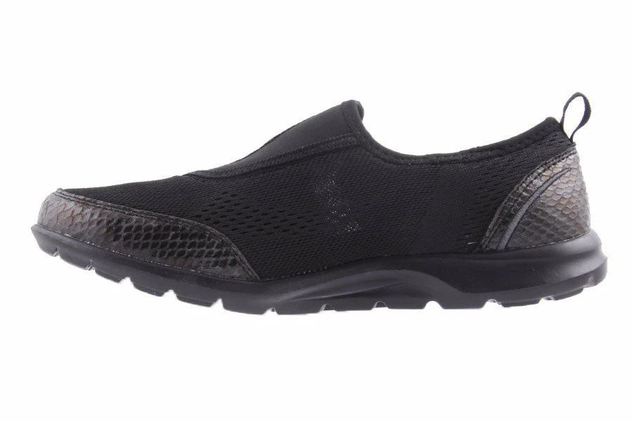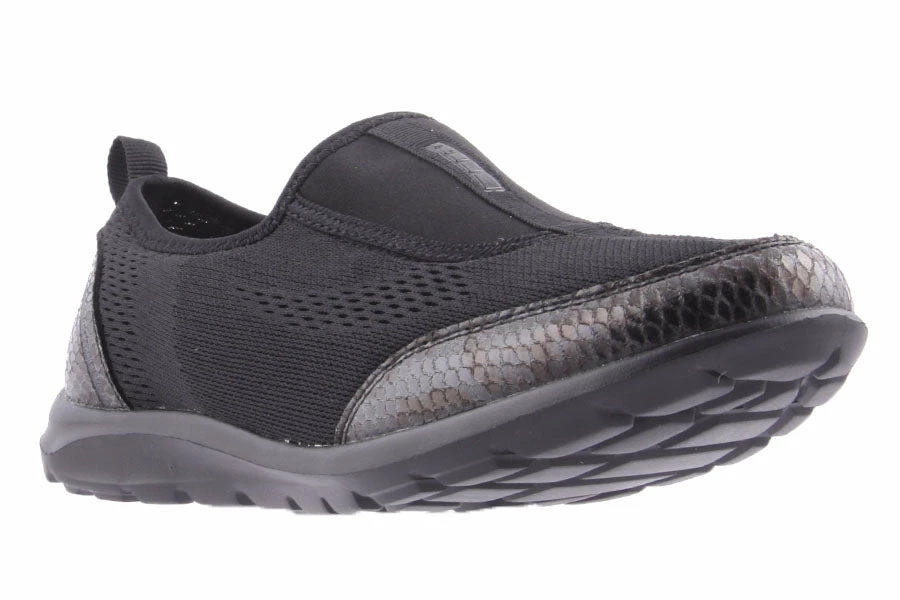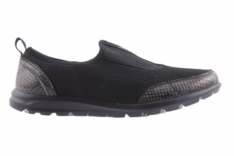 Zailey by Natural Comfort is a women’s lightweight slip on sneaker featuring a knitted mesh upper with snake printed details and a comfy padded insole.
