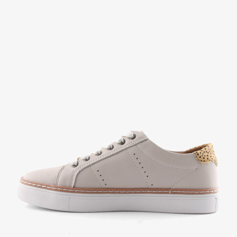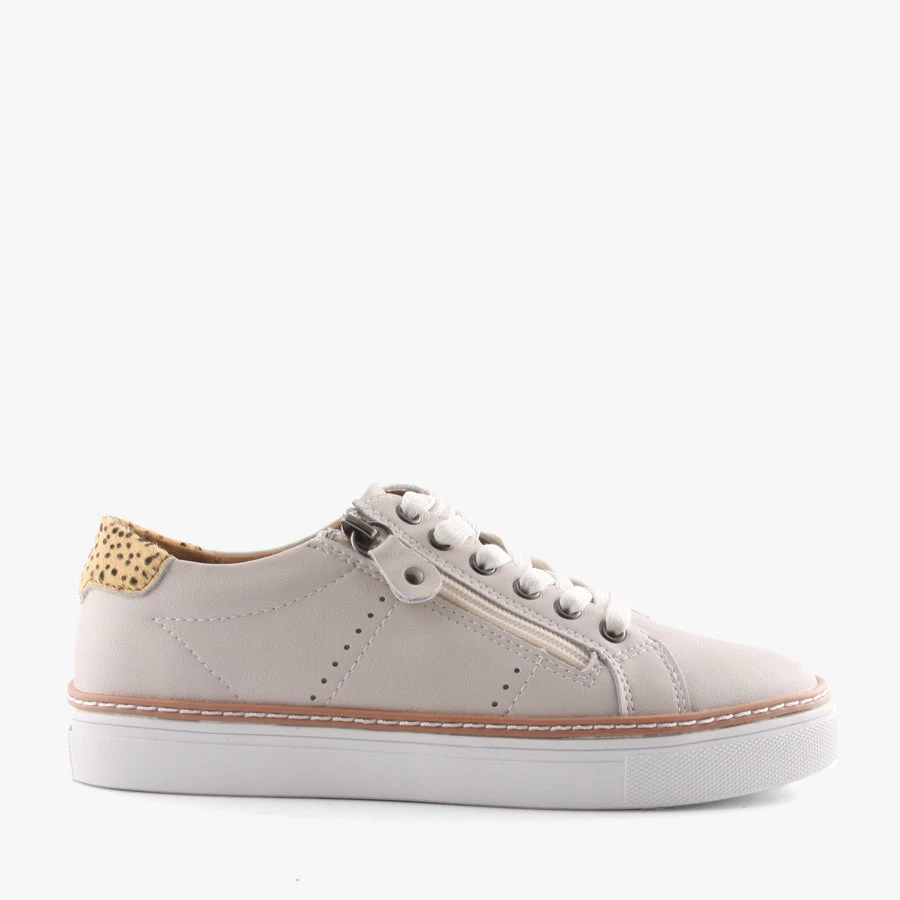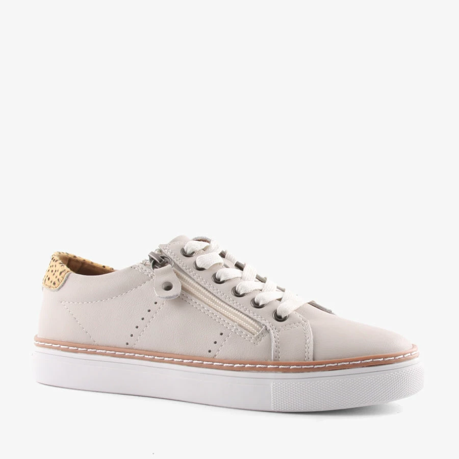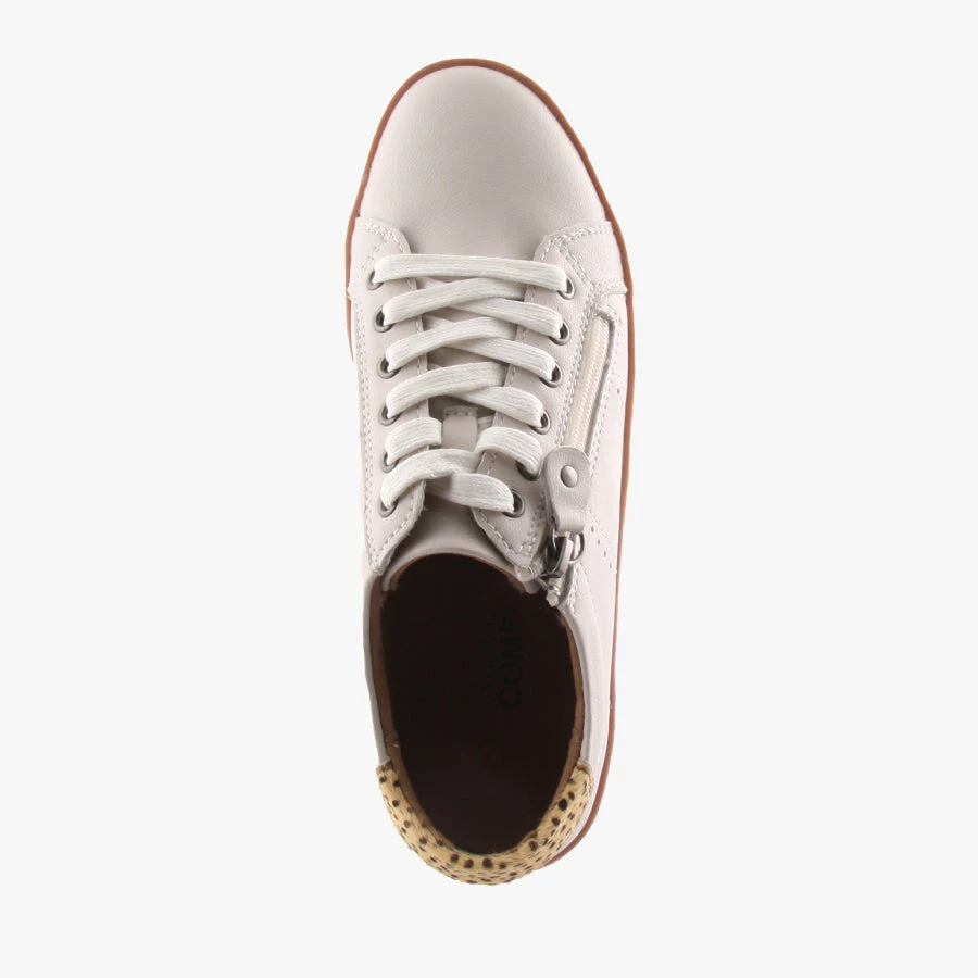 Jojo by Natural Comfort is a women’s leather sneaker with a front zipper and leopard print panel on the back of the heel.