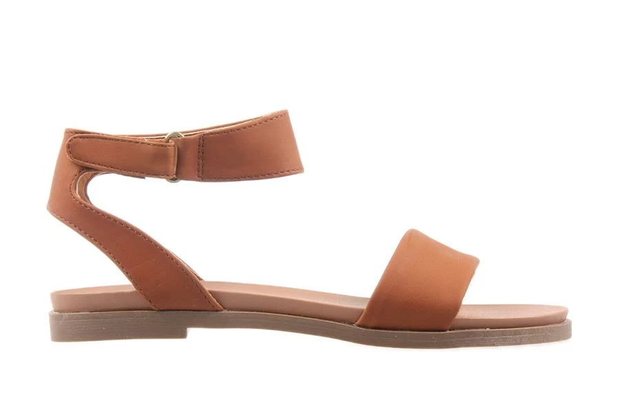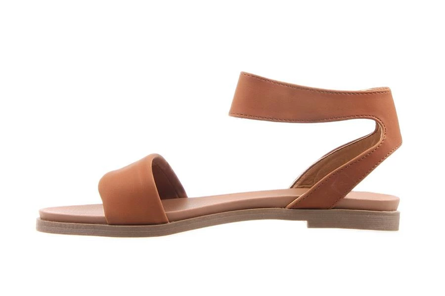 Letikka by Naughty Monkey is a women’s flat sandal featuring a single strap across the toe and an ankle strap with a loop closure.