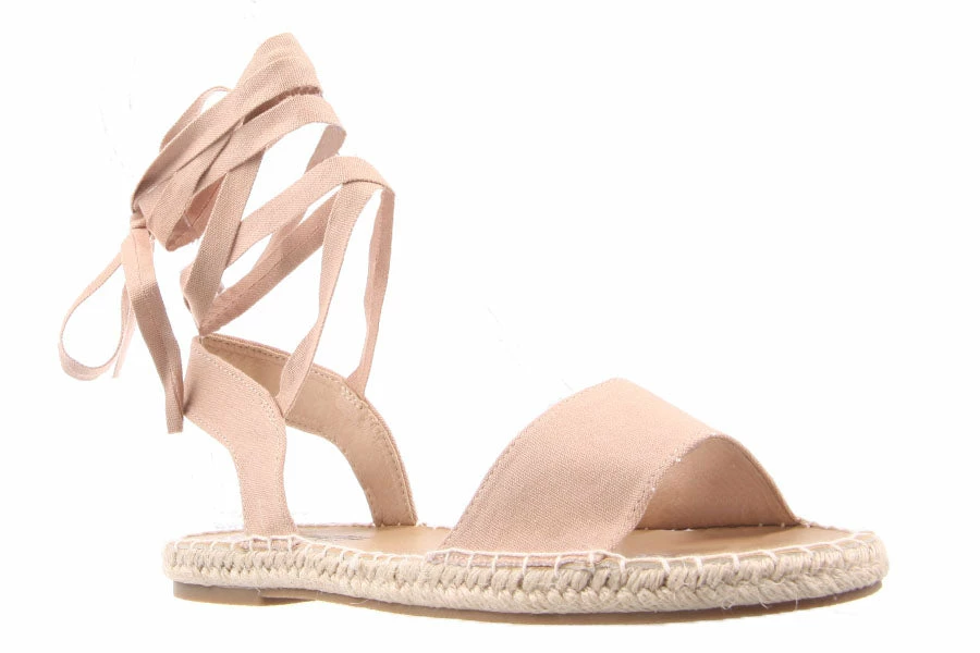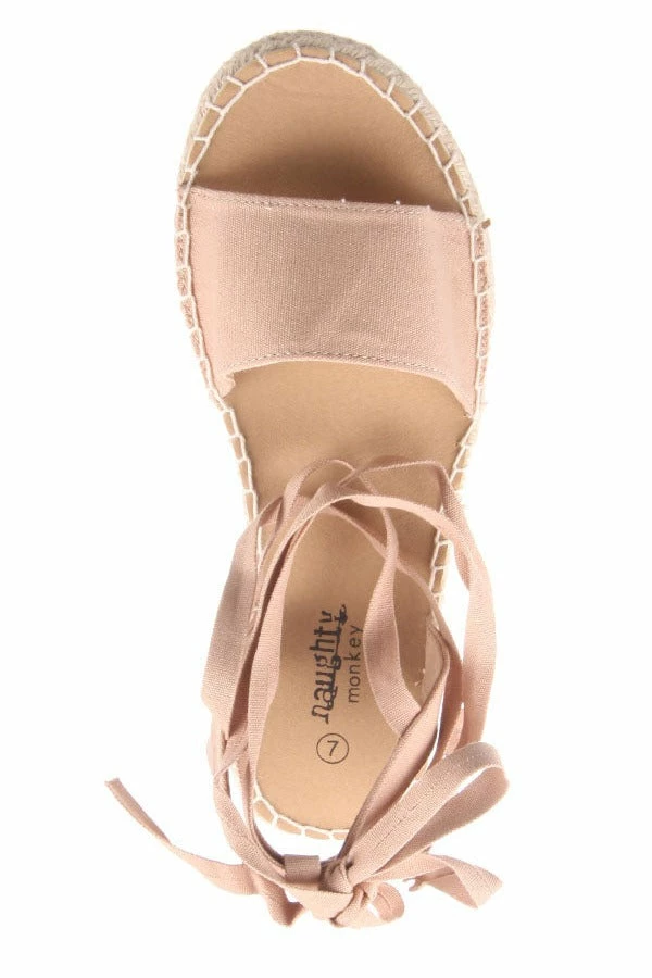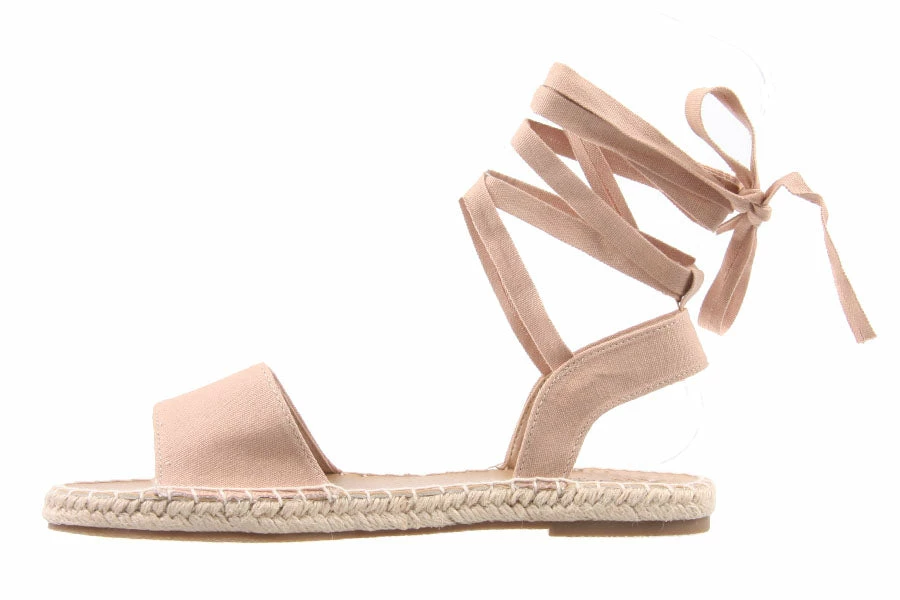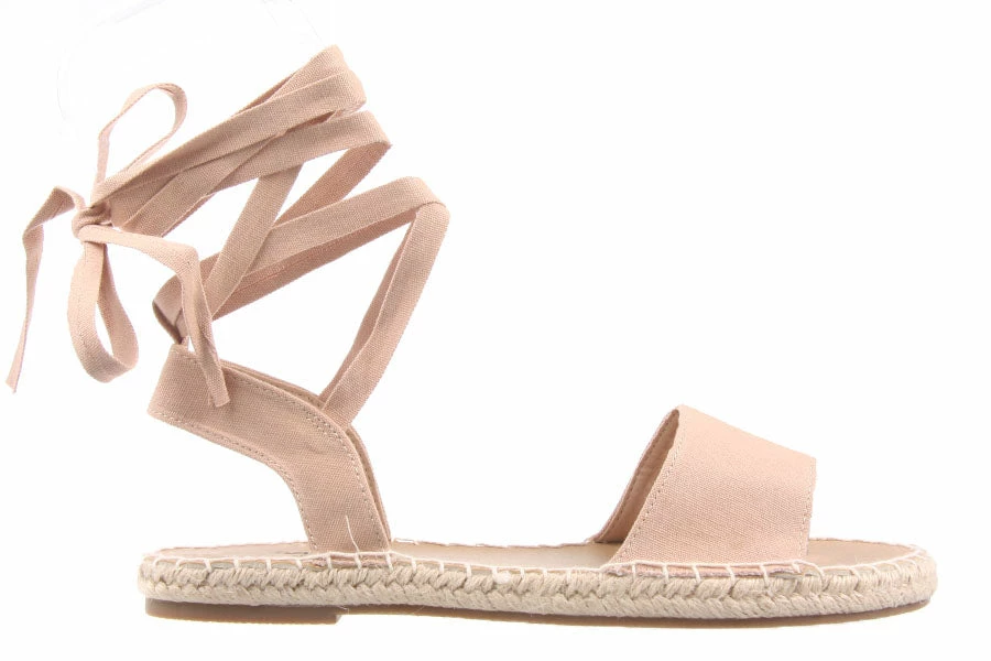 Oahu by Naughty Monkey is a great flat sandal for summer. Featuring a canvas upper with a tie up ankle strap with a rope trimmed sole.