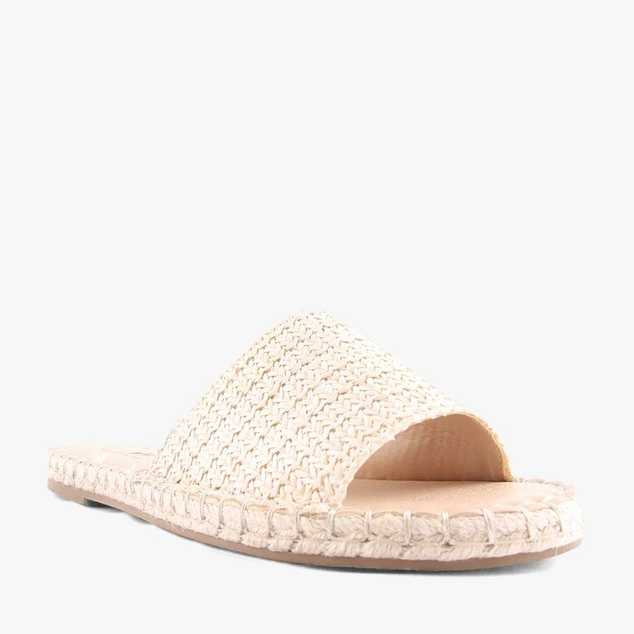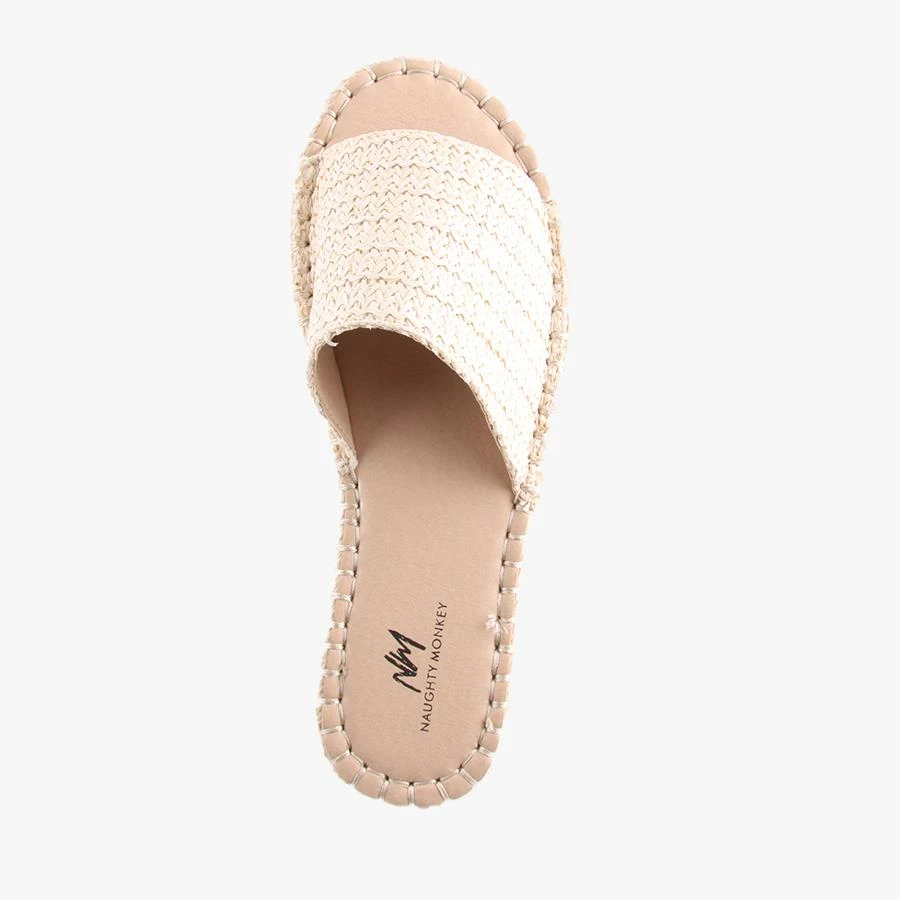 Priscila by Naughty Monkey is a flat slip on sandal featuring an espadrille trim and exposed stitching, perfect for an effortless summer look.