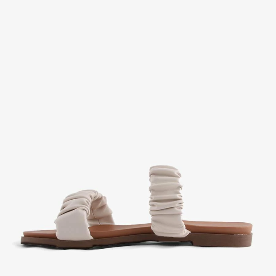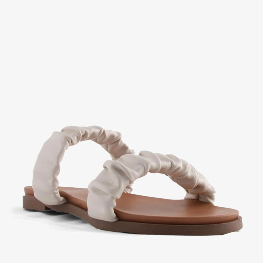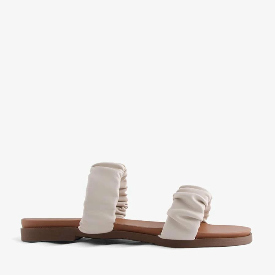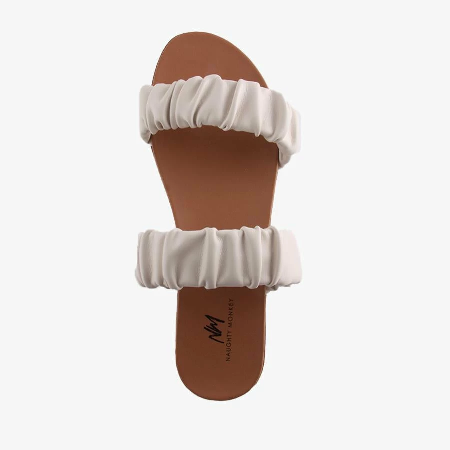 Eva by Naughty Monkey is a flat slide featuring two straps with ruching detail. Eva is the ultimate shoe for any occasion.