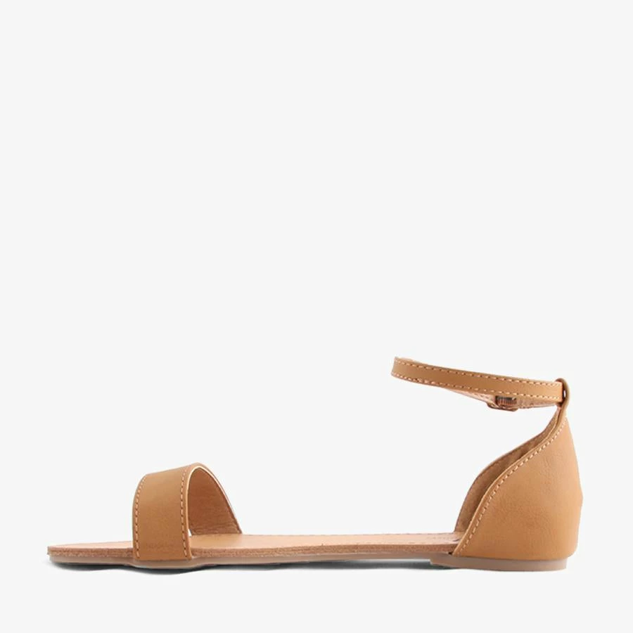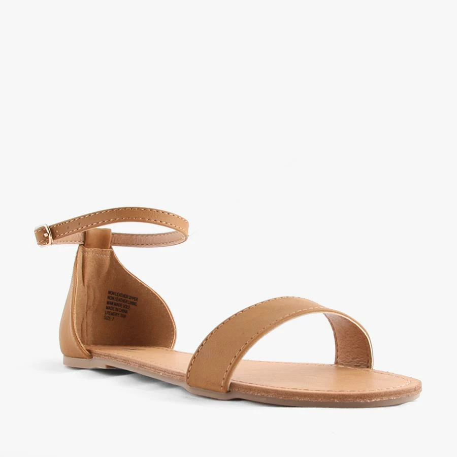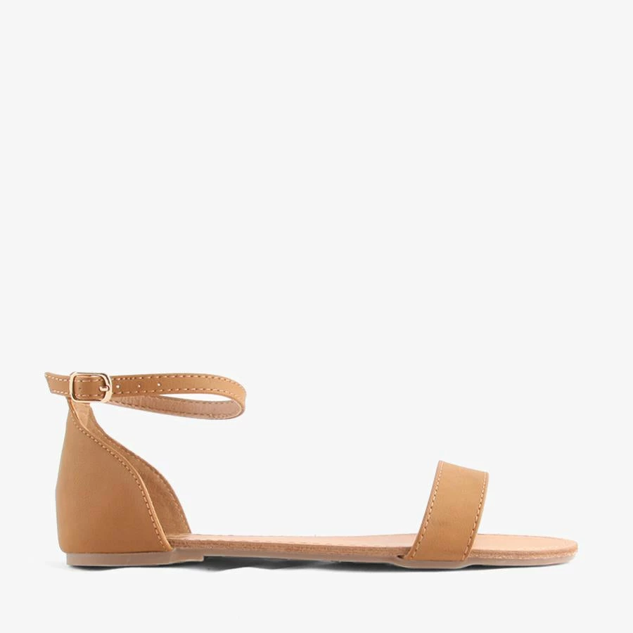Emery by Naughty Monkey is a women’s flat sandal featuring a thin adjustable ankle strap secured by an enclosed back quarter heel and horizontal strap across the toes.