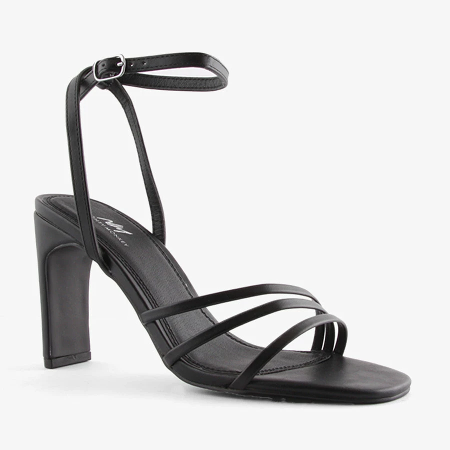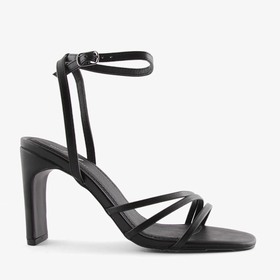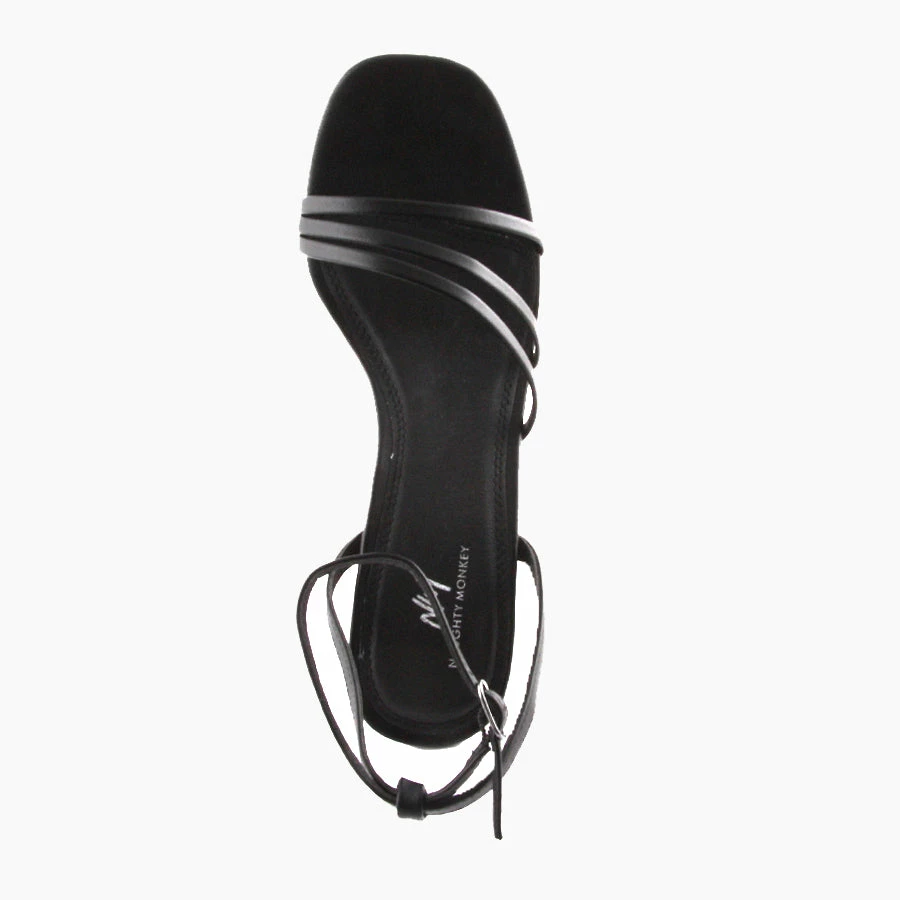 Tia by Naughty Monkey is a women’s ankle strap heel featuring a refined but sturdy slim block heel with an adjustable ankle strap and three thin straps sit across the toe and foot.