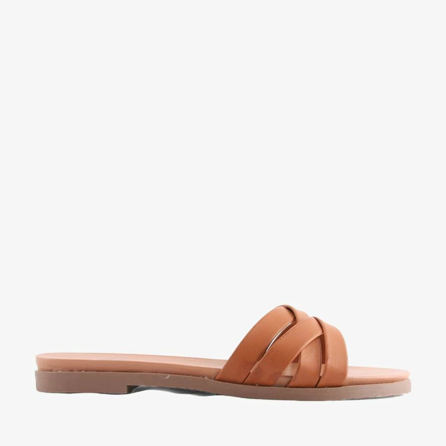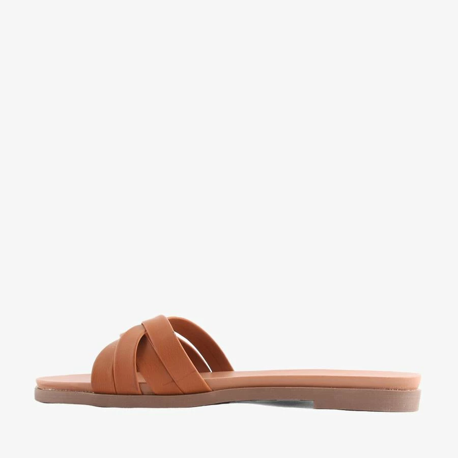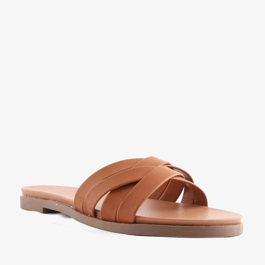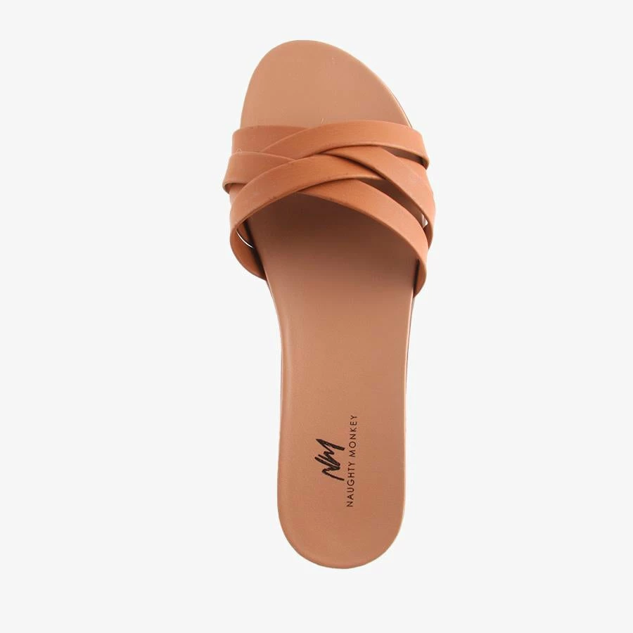 Chelle by Naughty Monkey is a flat slip on sandal featuring cross over straps across the toe. Although simple, this casual slip on sandal will compliment any outfit.