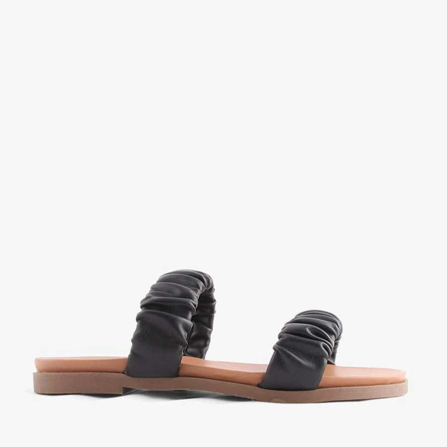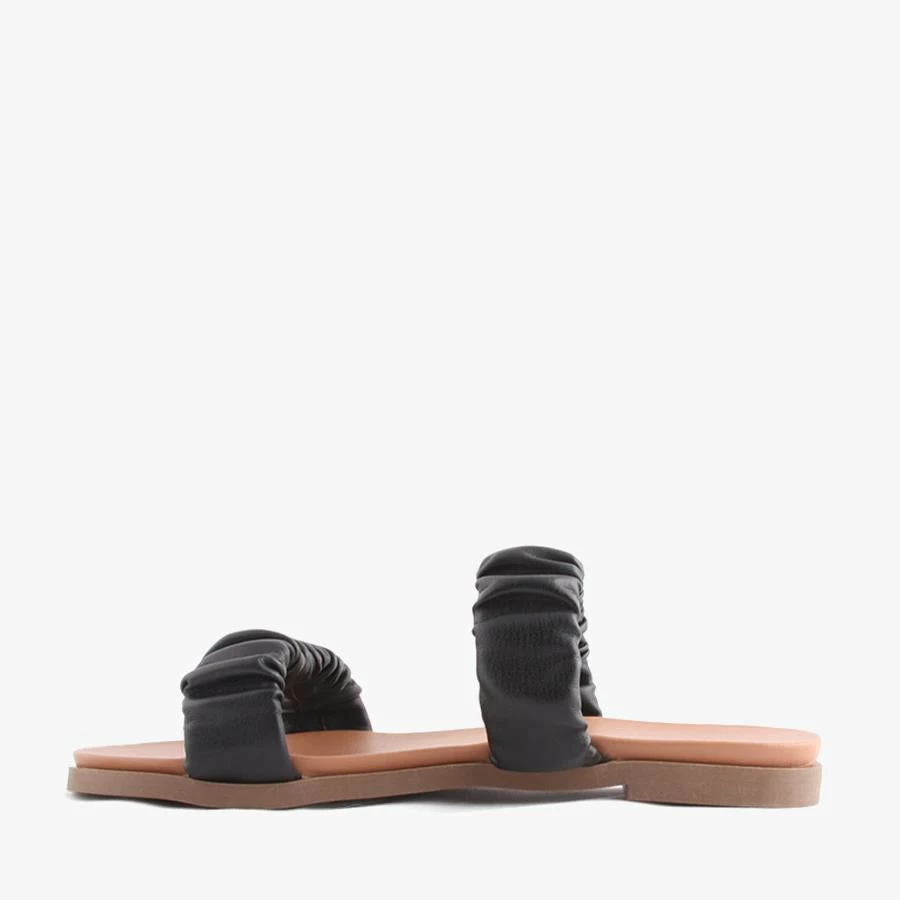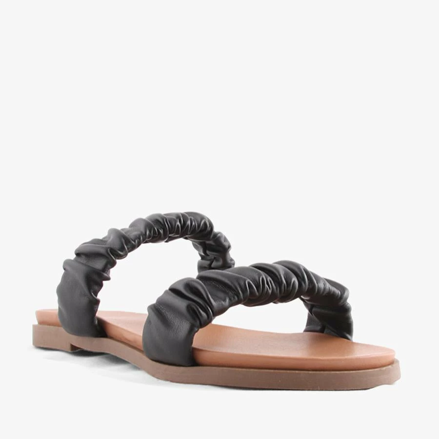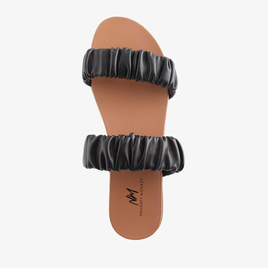 Eva by Naughty Monkey is a flat slide featuring two straps with ruching detail. Eva is the ultimate shoe for any occasion.