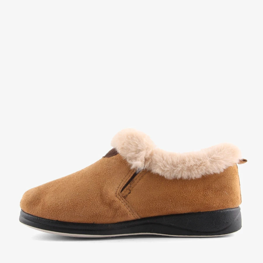 Elivia by Panda is a women’s slipper providing comfort and warmth. Featuring a microsuede upper with faux fur trim and a flexible sole.