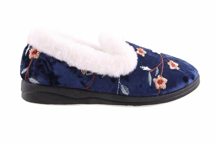 Emille by Panda is a women’s slipper with a velour upper and embroidered details, a soft faux fur lining and cushion. All Panda slipper feature a non-marking rubber outsole.