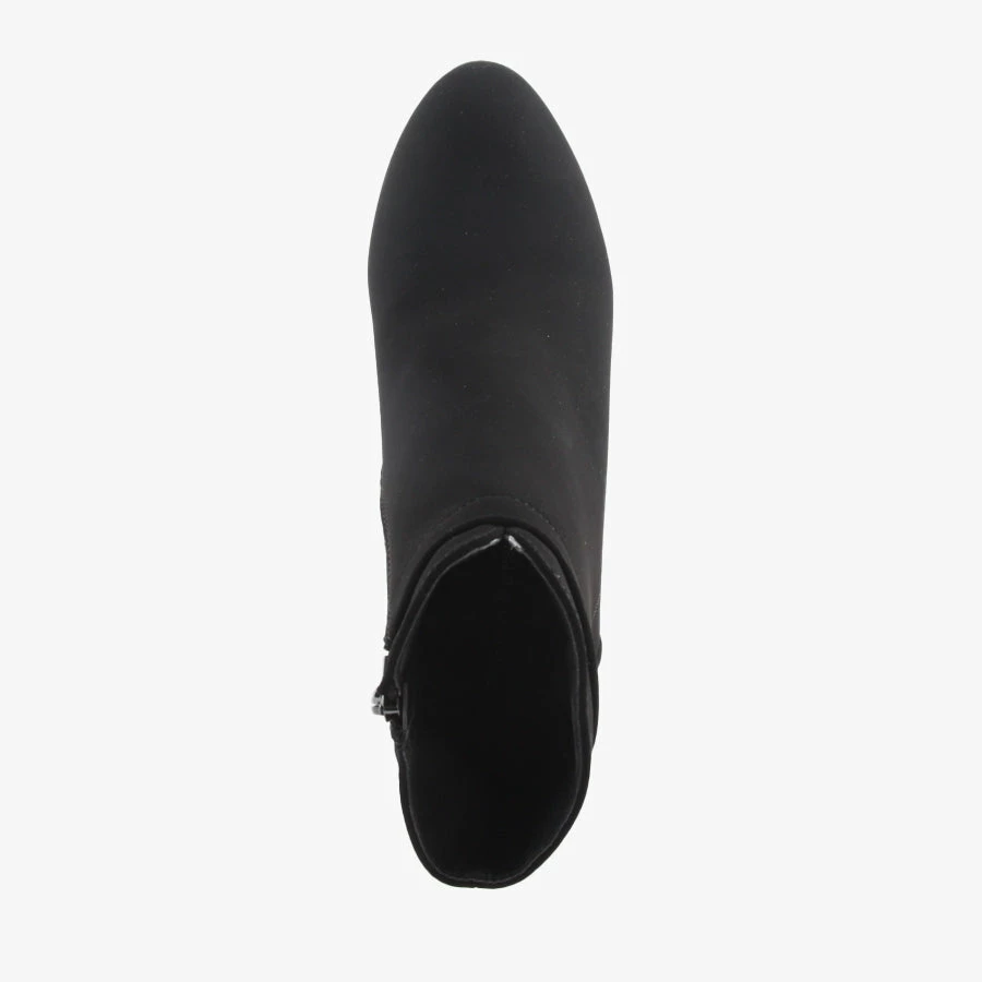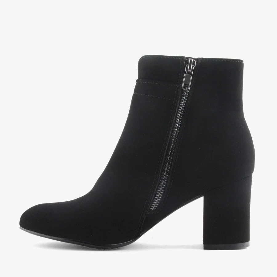 Luisa by Pied A Terre is a women’s ankle boot featuring a microsuede upper detailed with piping trim and a metallic side zipper on a stacked heel.
