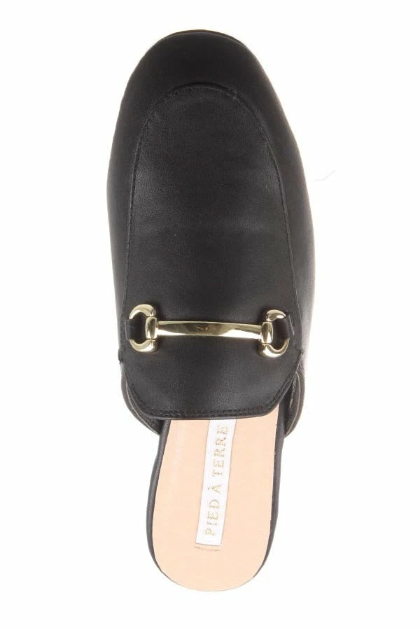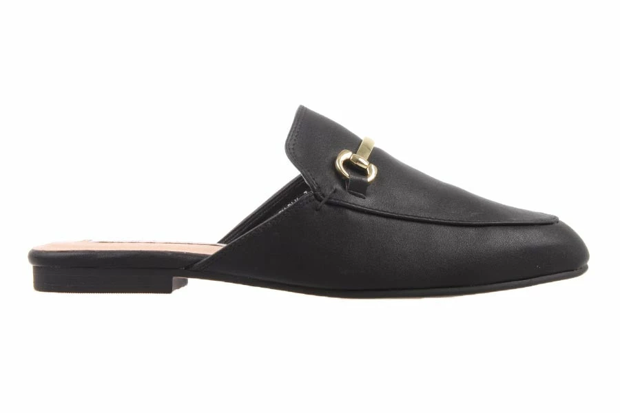 Slide into Shinzu by Pied A Terre. This women’s mule features gold buckle trim on the upper with a rounded toe.